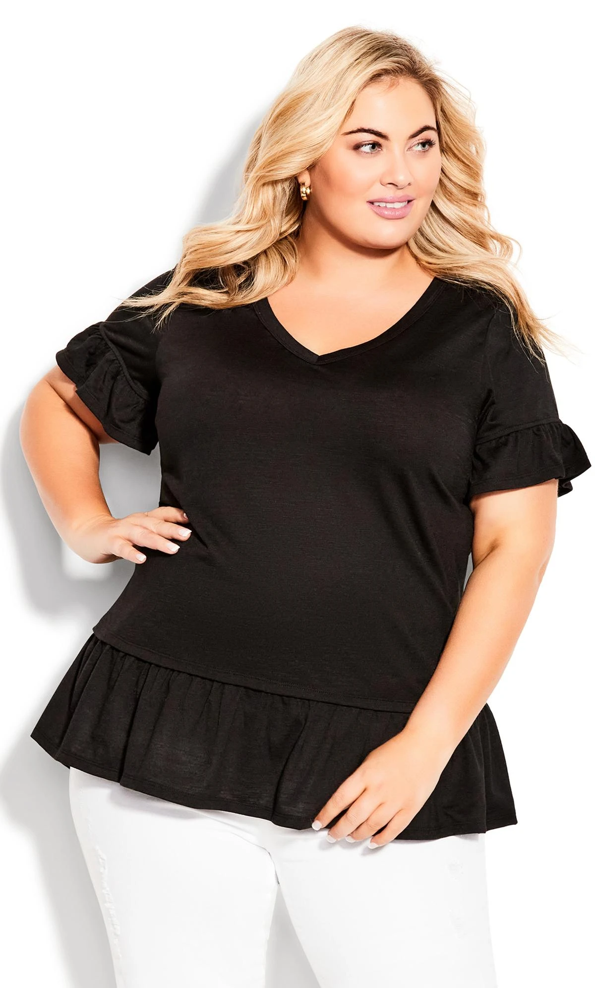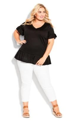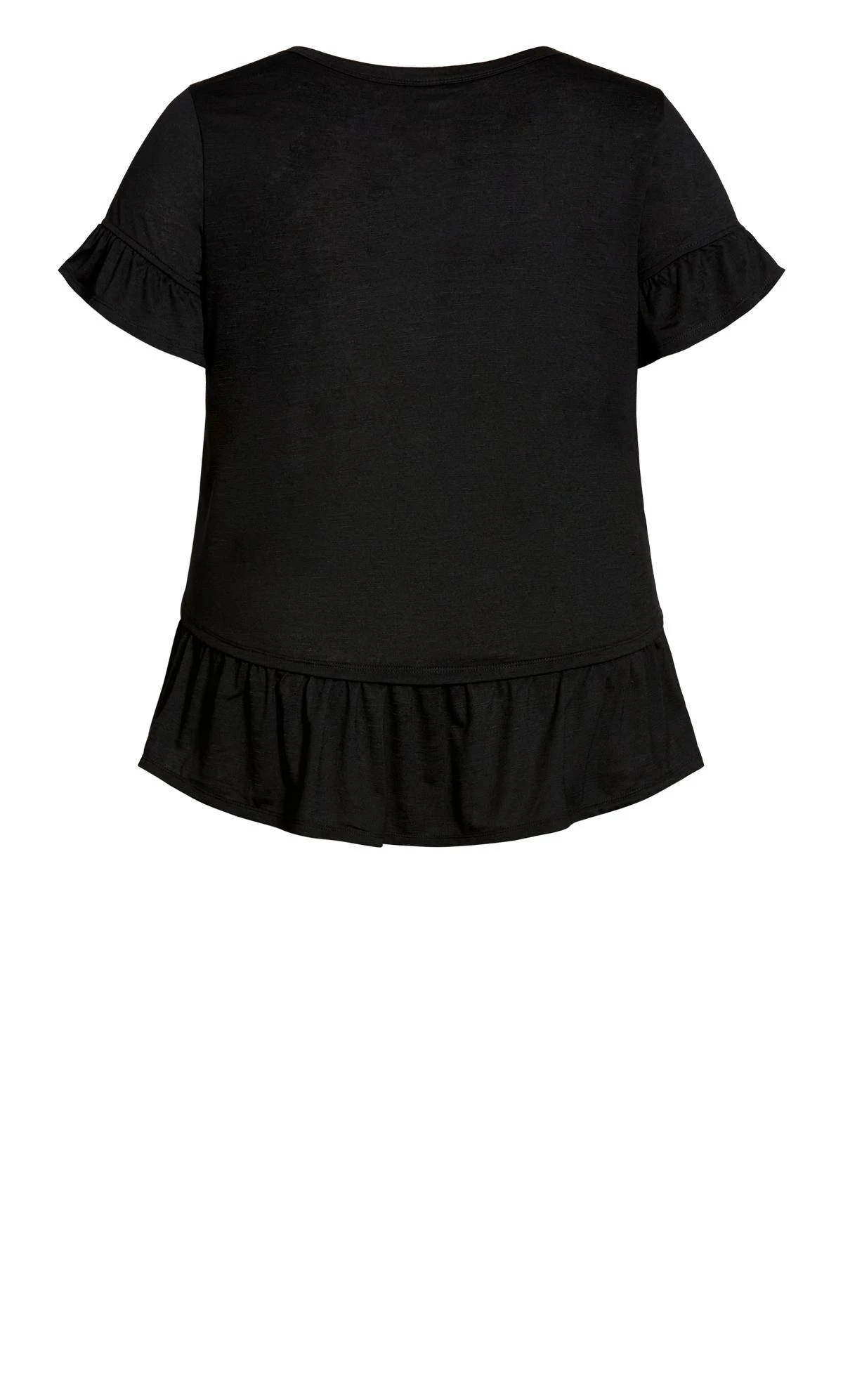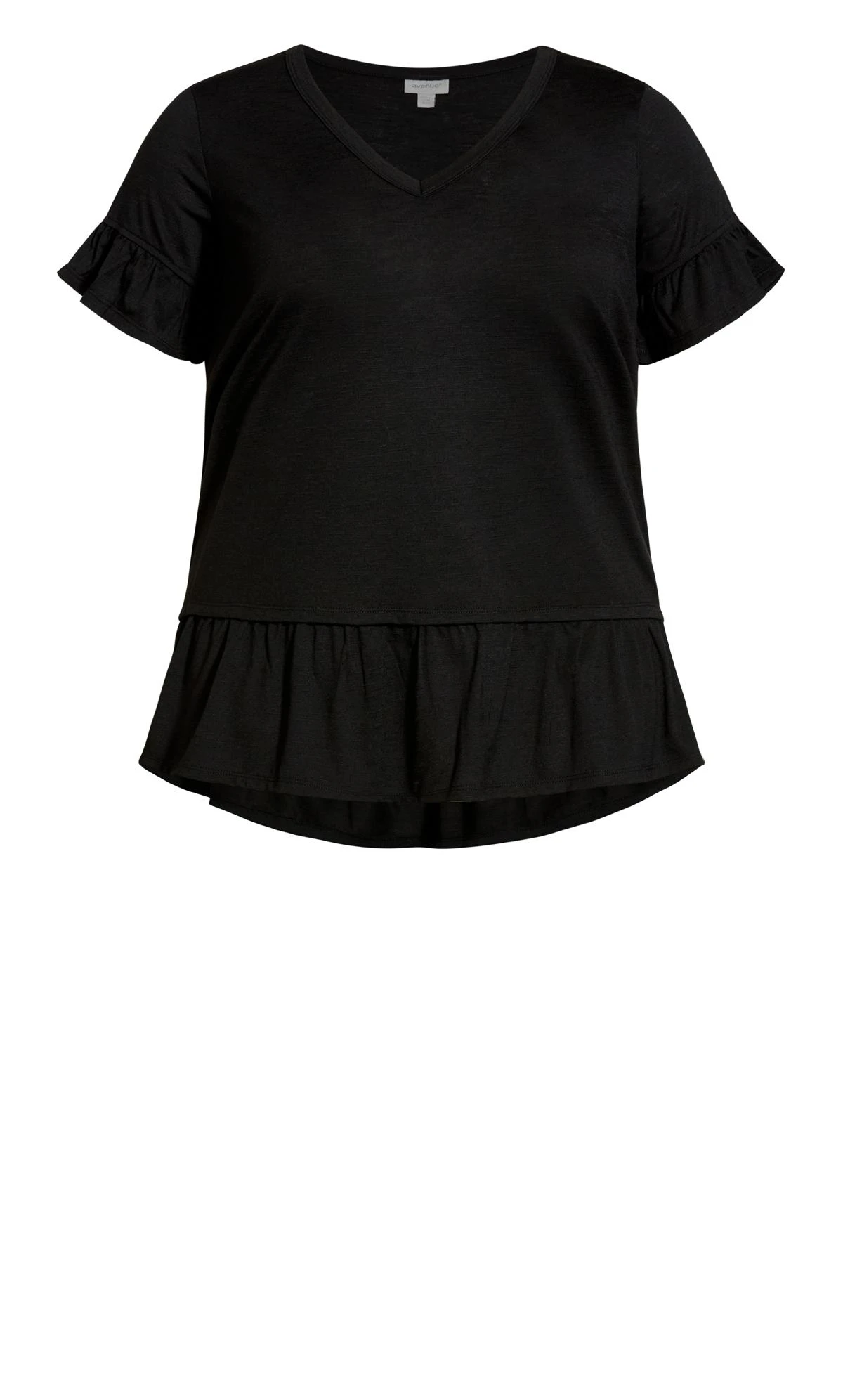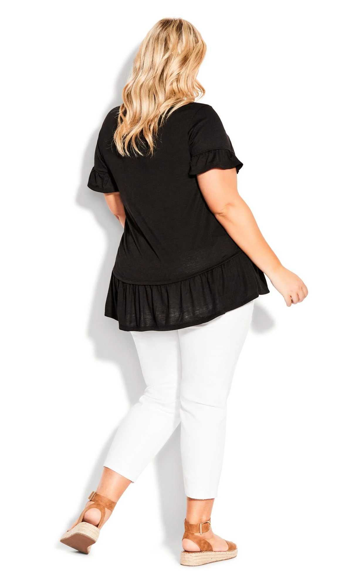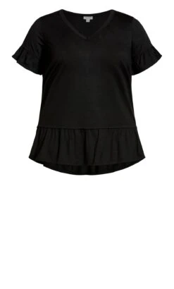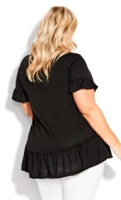 Discover the Avenue Black Frill Hem Short Sleeve T-Shirt, a stylish and playful addition to your collection. With its charming frill hem detail, this t-shirt adds a touch of femininity to your outfit. Pair it with high-waisted jeans and ballet flats for a casual yet chic look, or combine it with a skirt and heeled sandals for a versatile ensemble that suits various occasions.