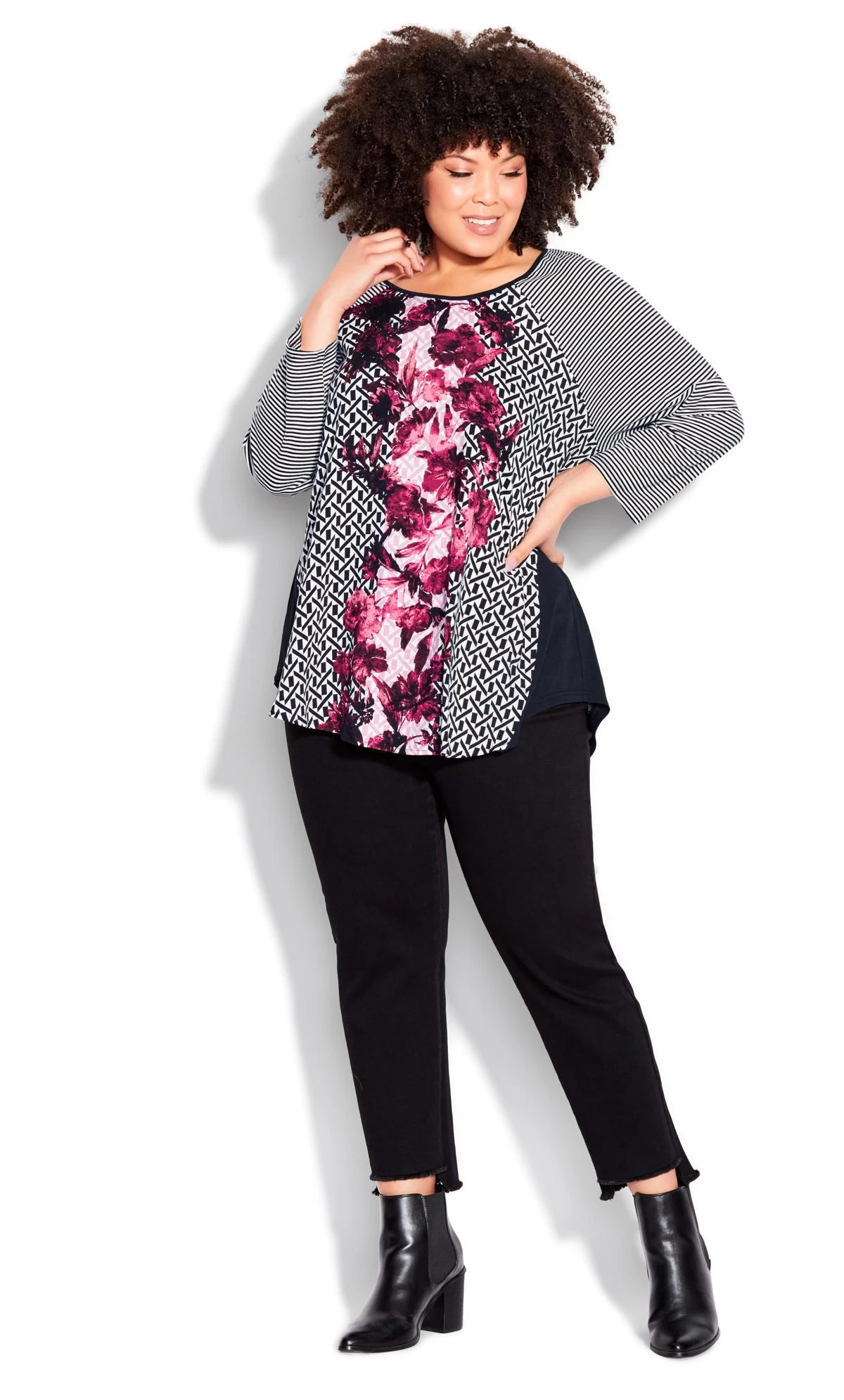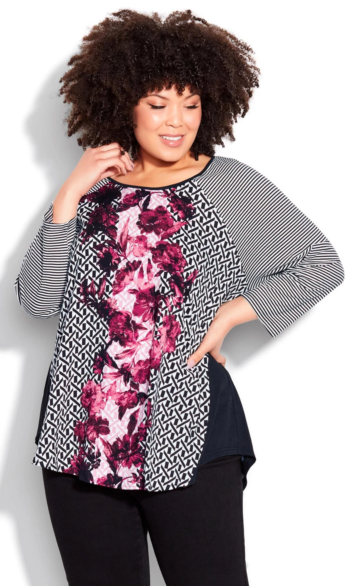 – Curved hemline at hips