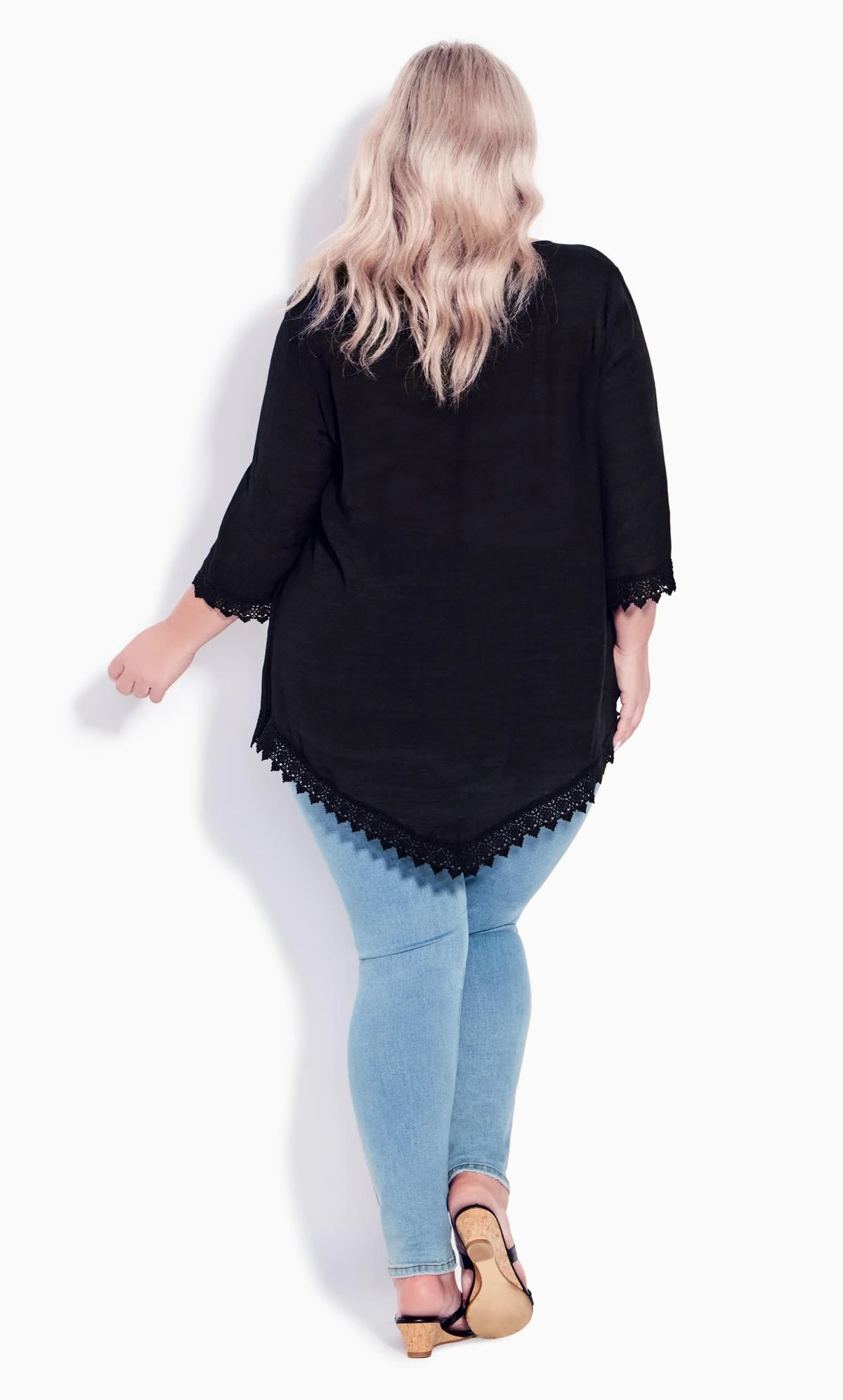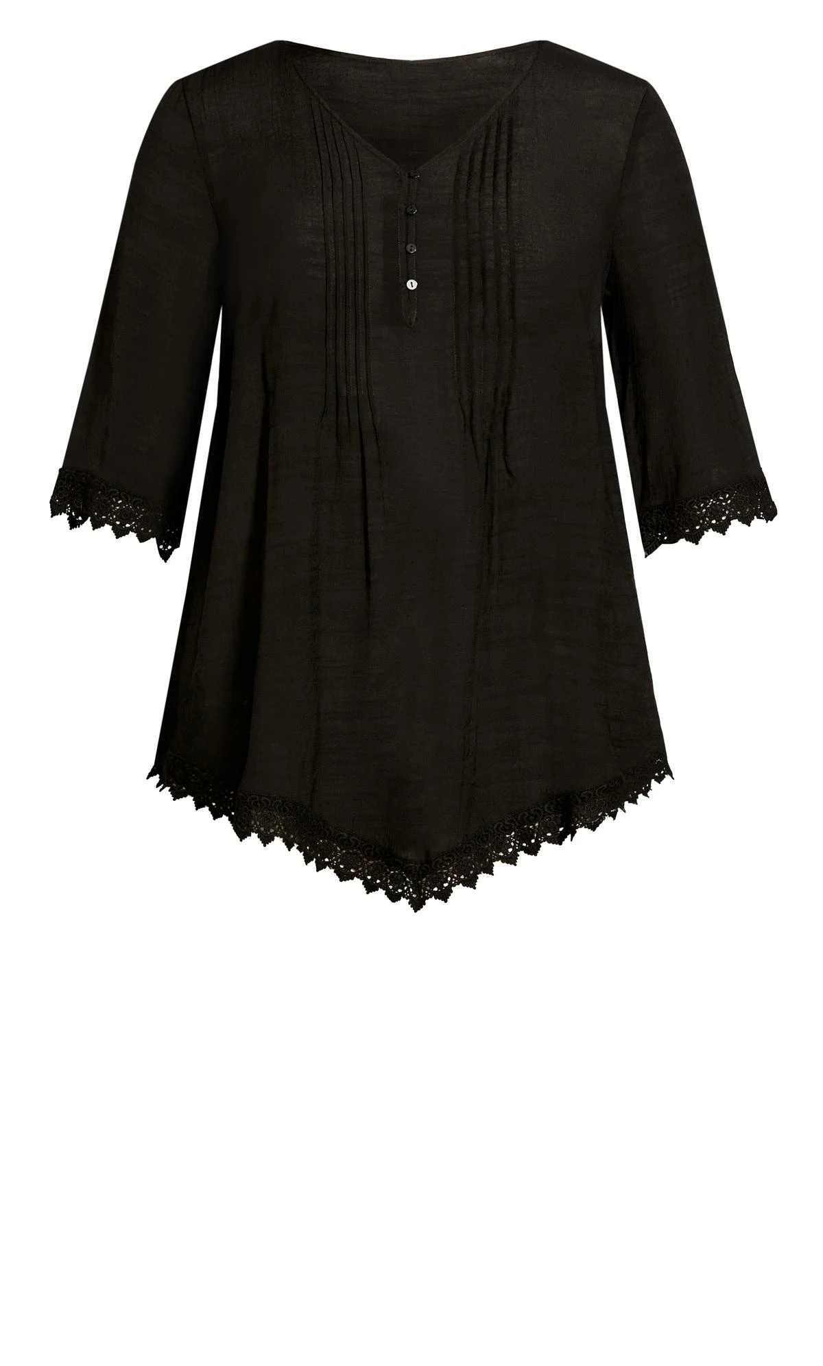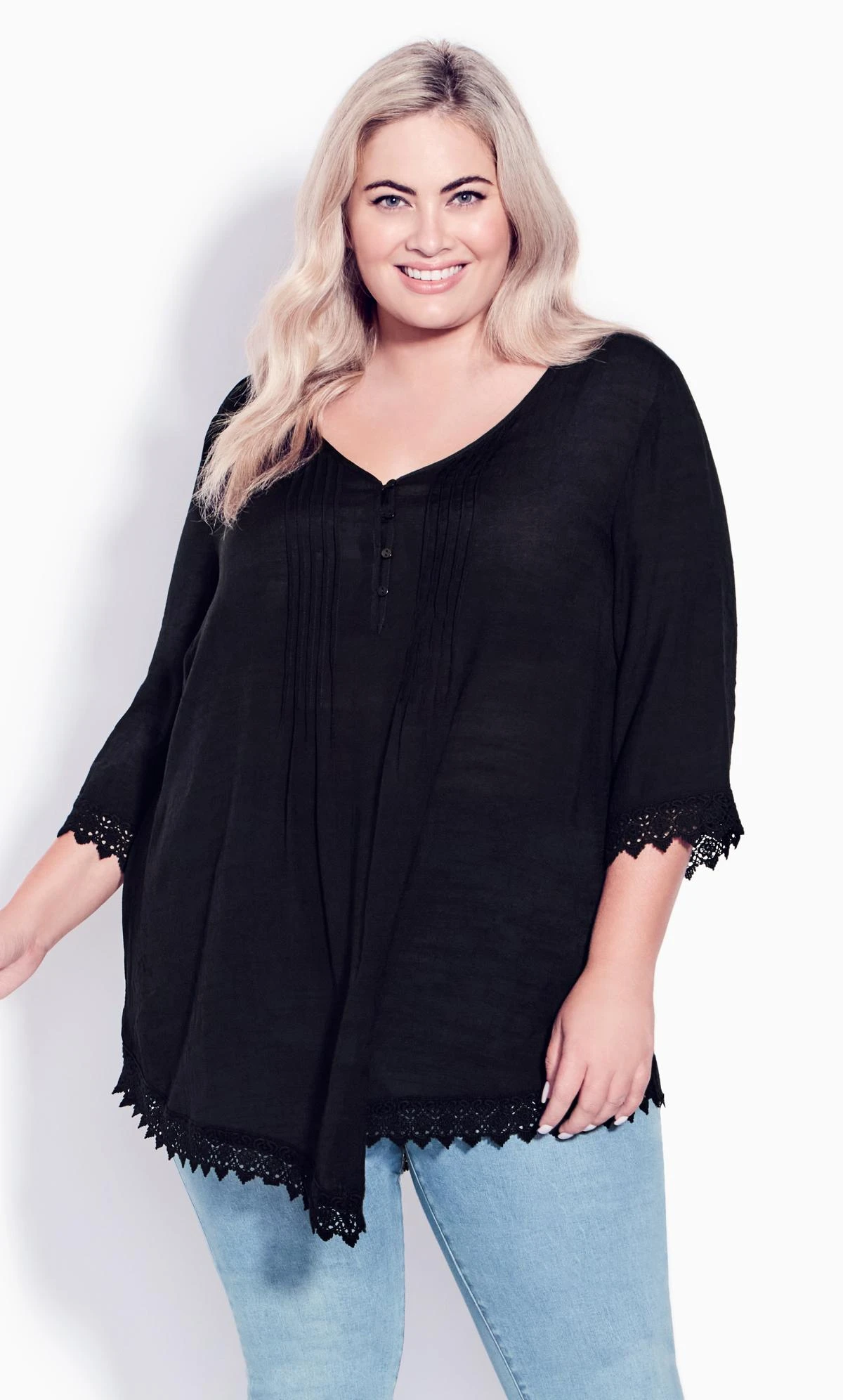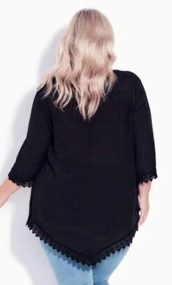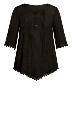 Elevate your look with the Avenue Black Pintuck Detail Lace Hem Top. This elegant top features delicate pintuck detailing and a lace hem, adding a touch of sophistication to your outfit. Perfect for a semi-formal occasion or a stylish outing, pair it with tailored trousers or jeans for a chic and refined ensemble that effortlessly captures attention and showcases your individual style.