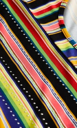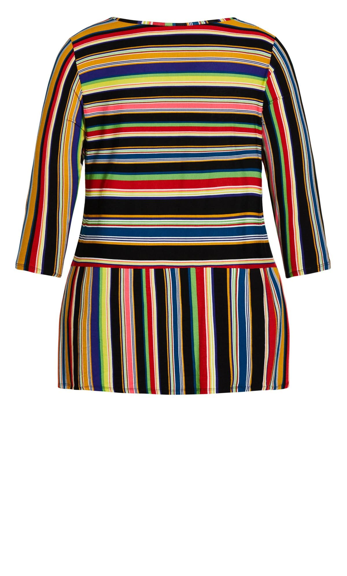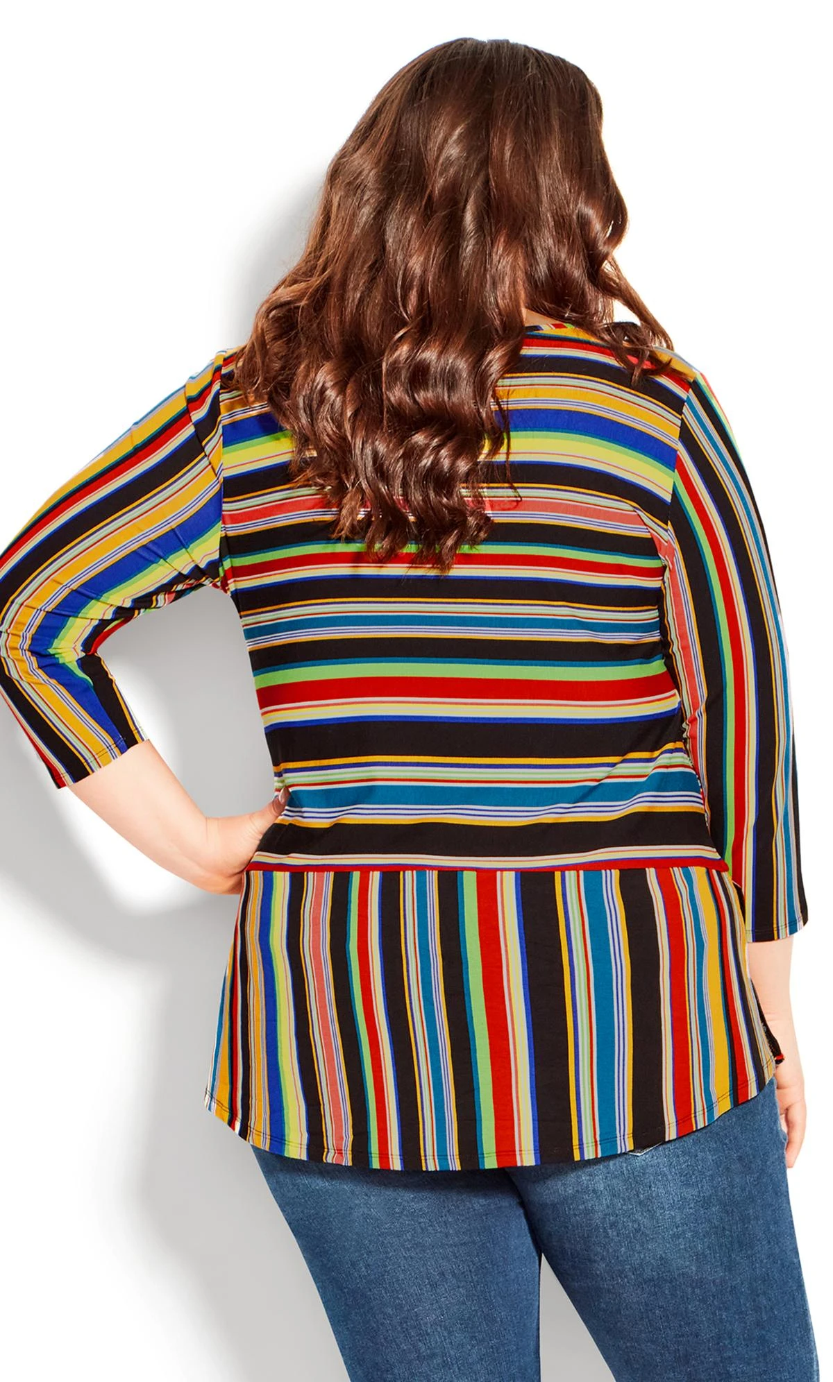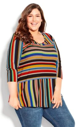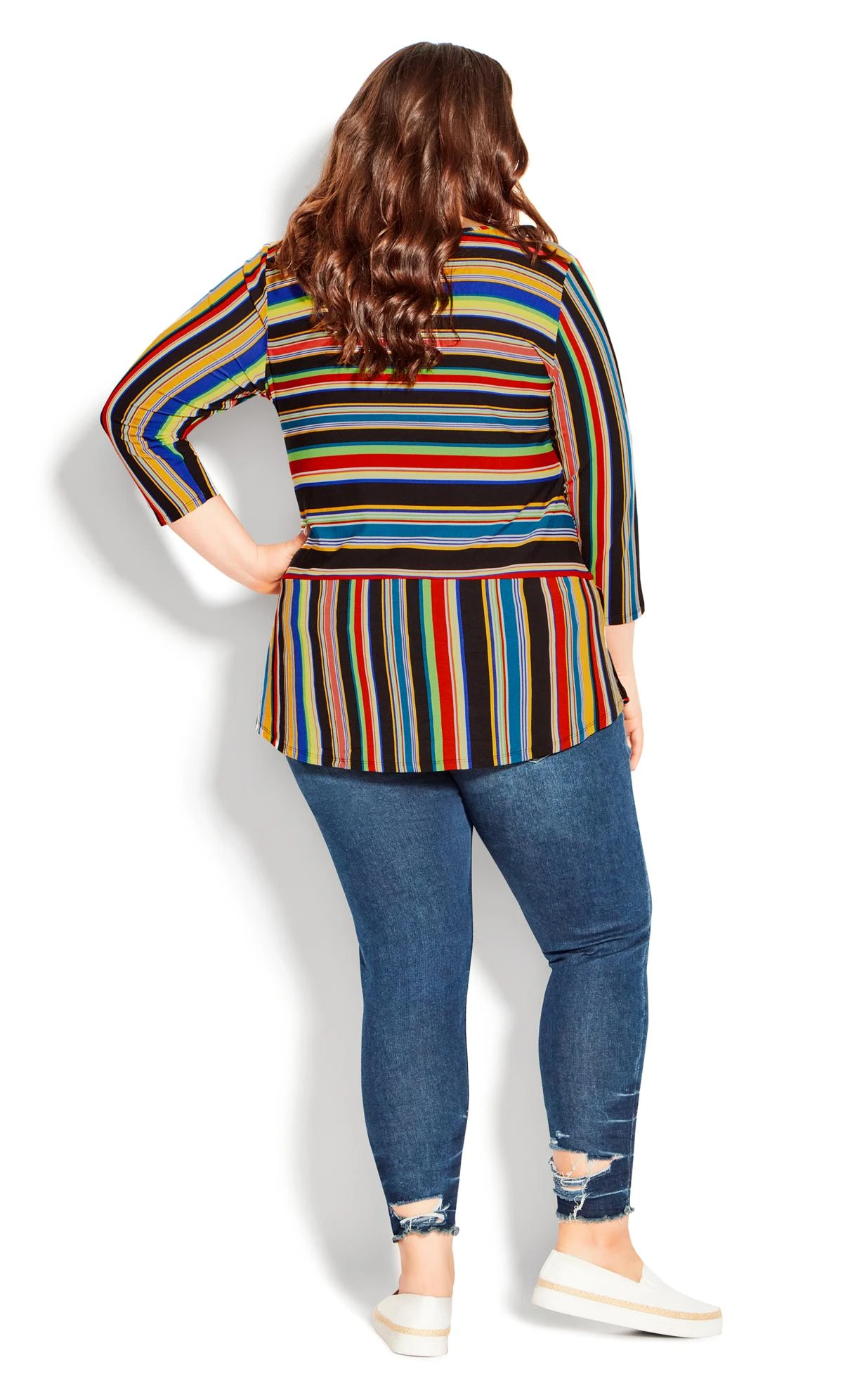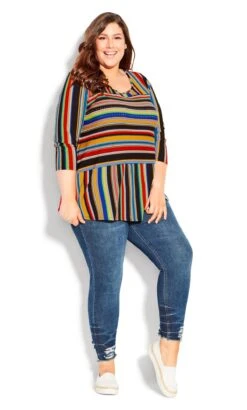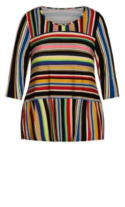Experience vibrant style with Avenue’s Black & Rainbow Stripe Long Sleeve Top. The classic black hue meets playful rainbow stripes, creating a charming and eye-catching ensemble. With long sleeves for added comfort, this top effortlessly balances color and fashion, making it a must-have for adding flair to your everyday look.