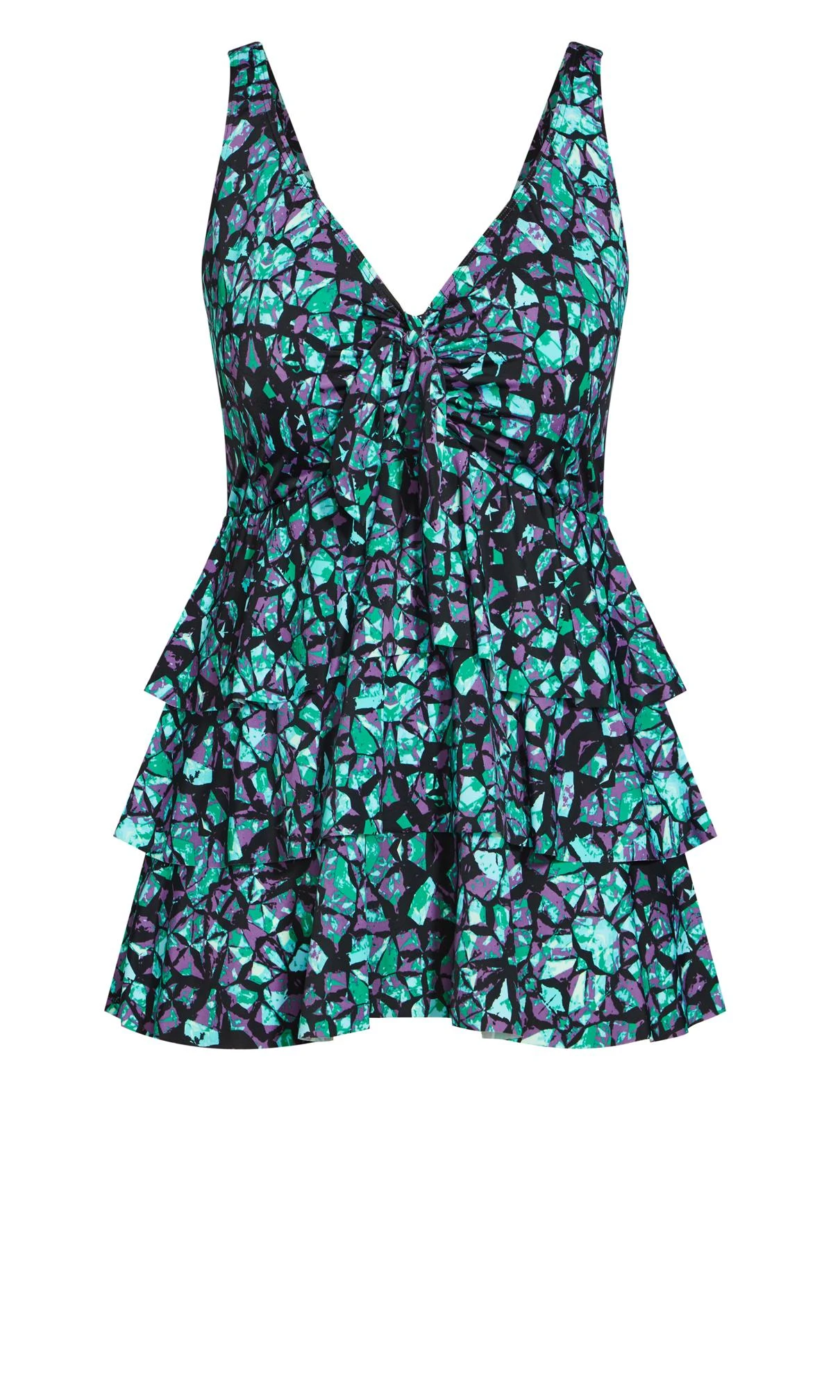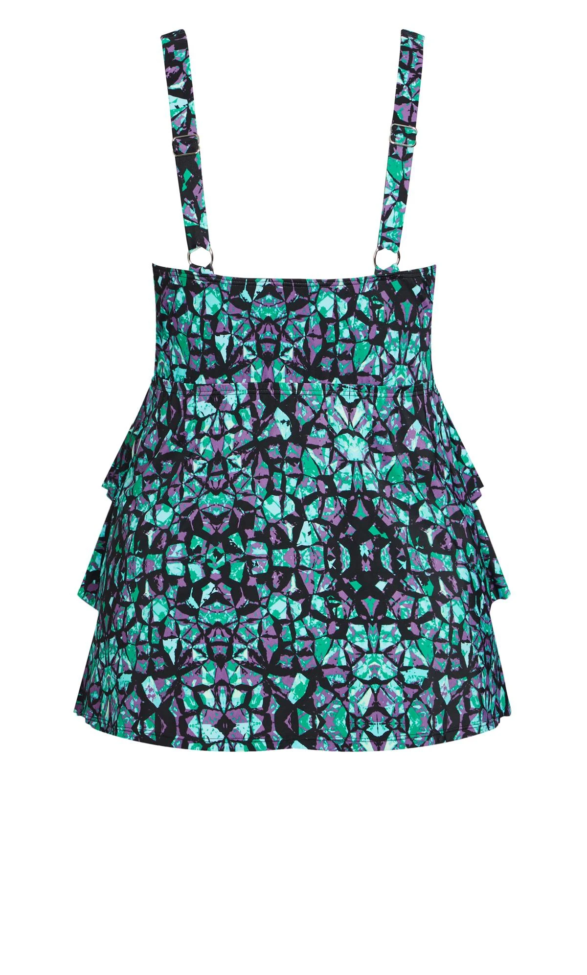 Upgrade your poolside ensemble with the Avenue Black Tile Print Ruffle Tankini Top. This tankini top effortlessly combines chic design with a touch of whimsy, showcasing a captivating black tile print adorned with playful ruffles. The versatile black hue adds a timeless elegance, making it perfect for beach getaways or lounging by the water. Elevate your swimwear collection with this black tile print ruffle tankini top that seamlessly merges fashion and comfort for a stylish beach-ready look.