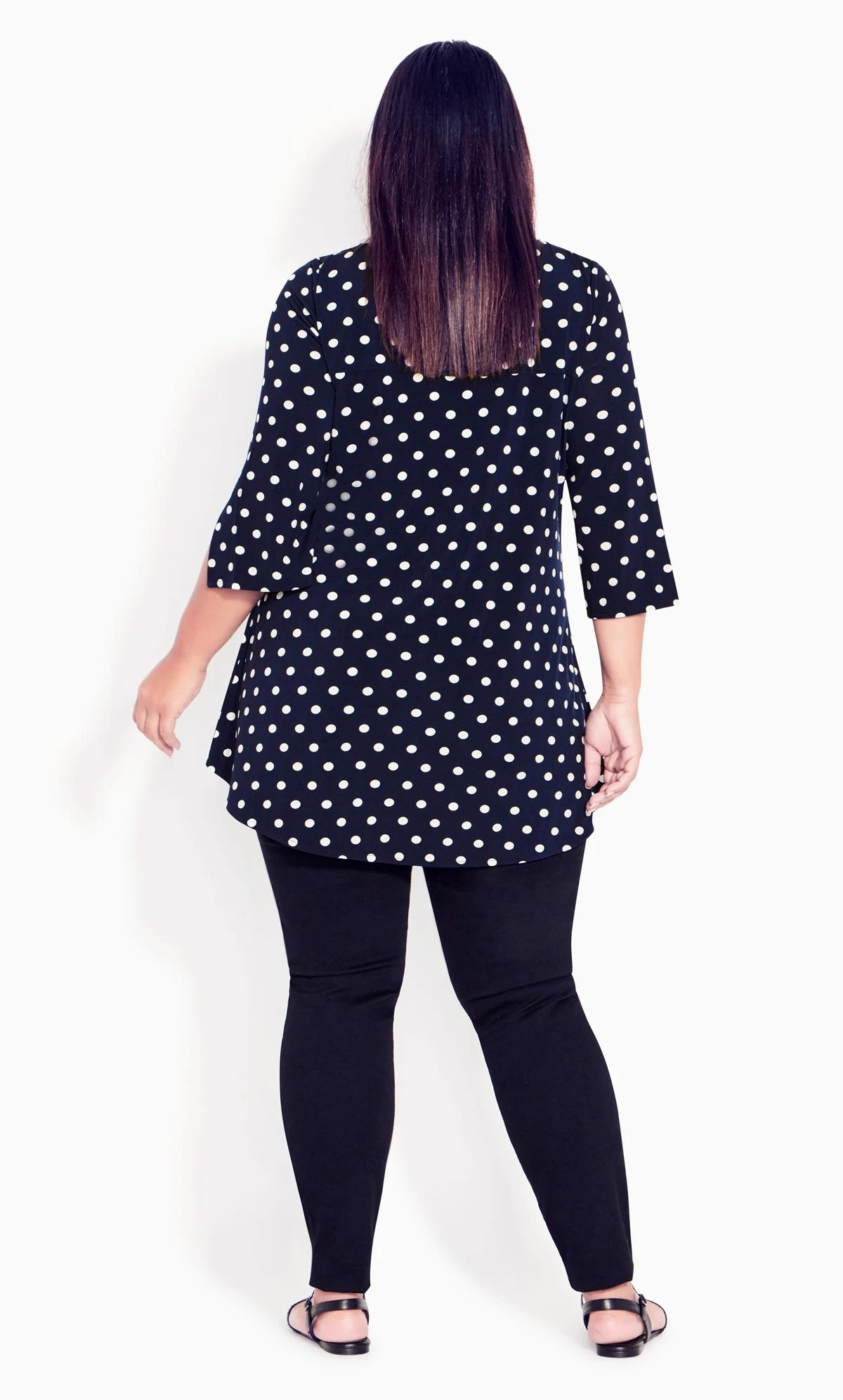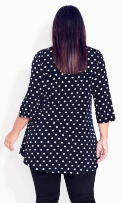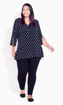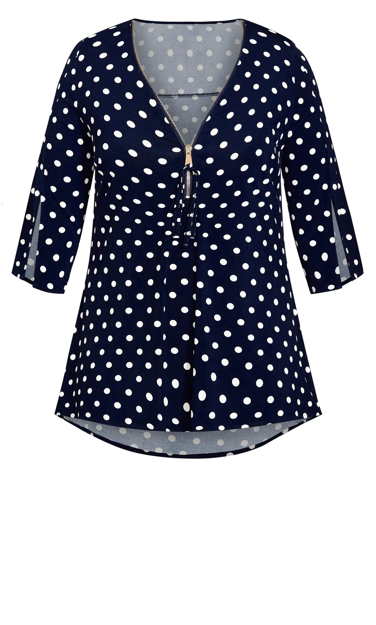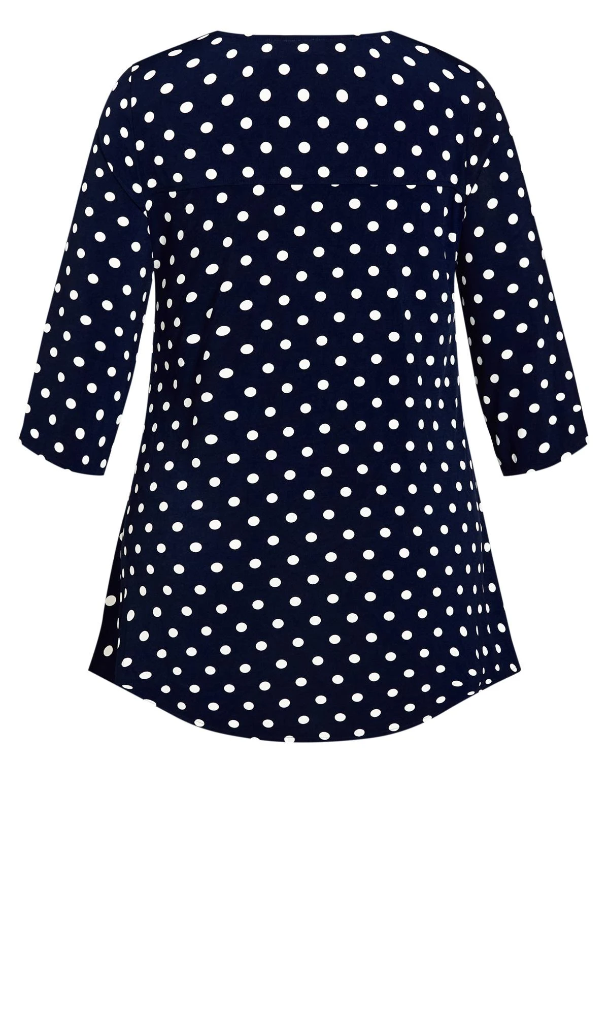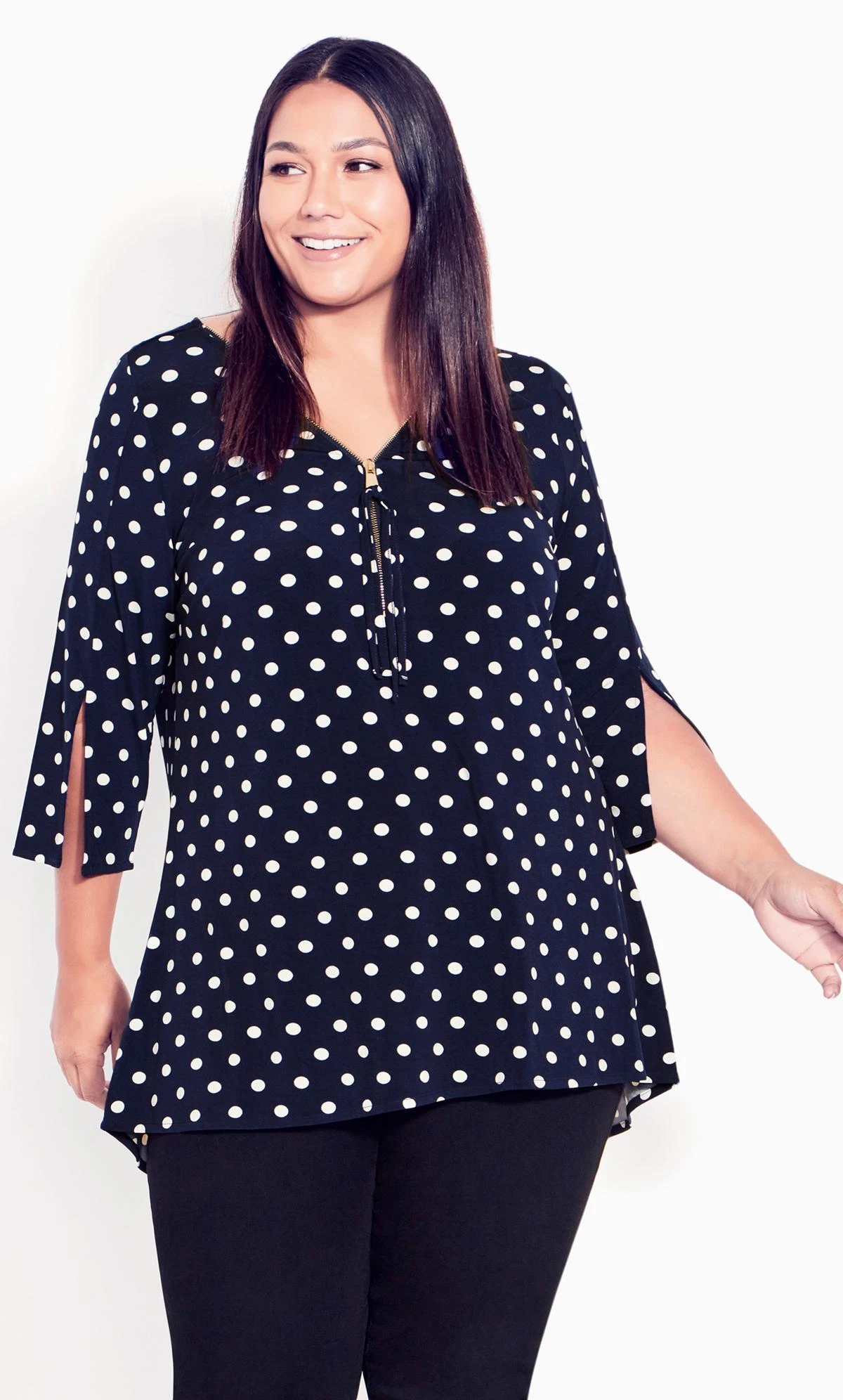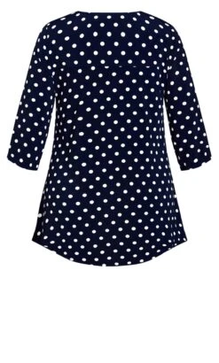Elevate your style with the Avenue Navy Blue Polka Dot Split Sleeve Top. The classic navy hue adorned with playful polka dots and split sleeve detail create a chic and charming look. With its unique design, this top effortlessly blends fashion and comfort, making it a versatile addition to your wardrobe for expressing your fashion sense with confidence.