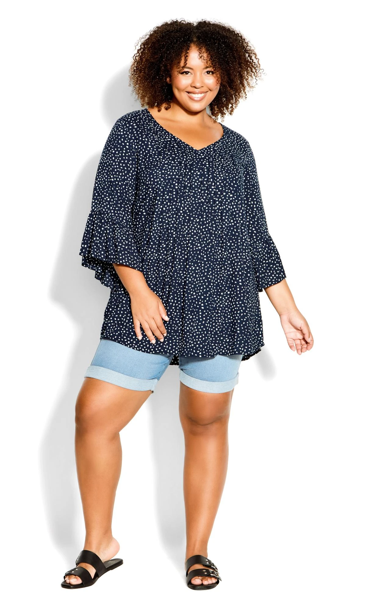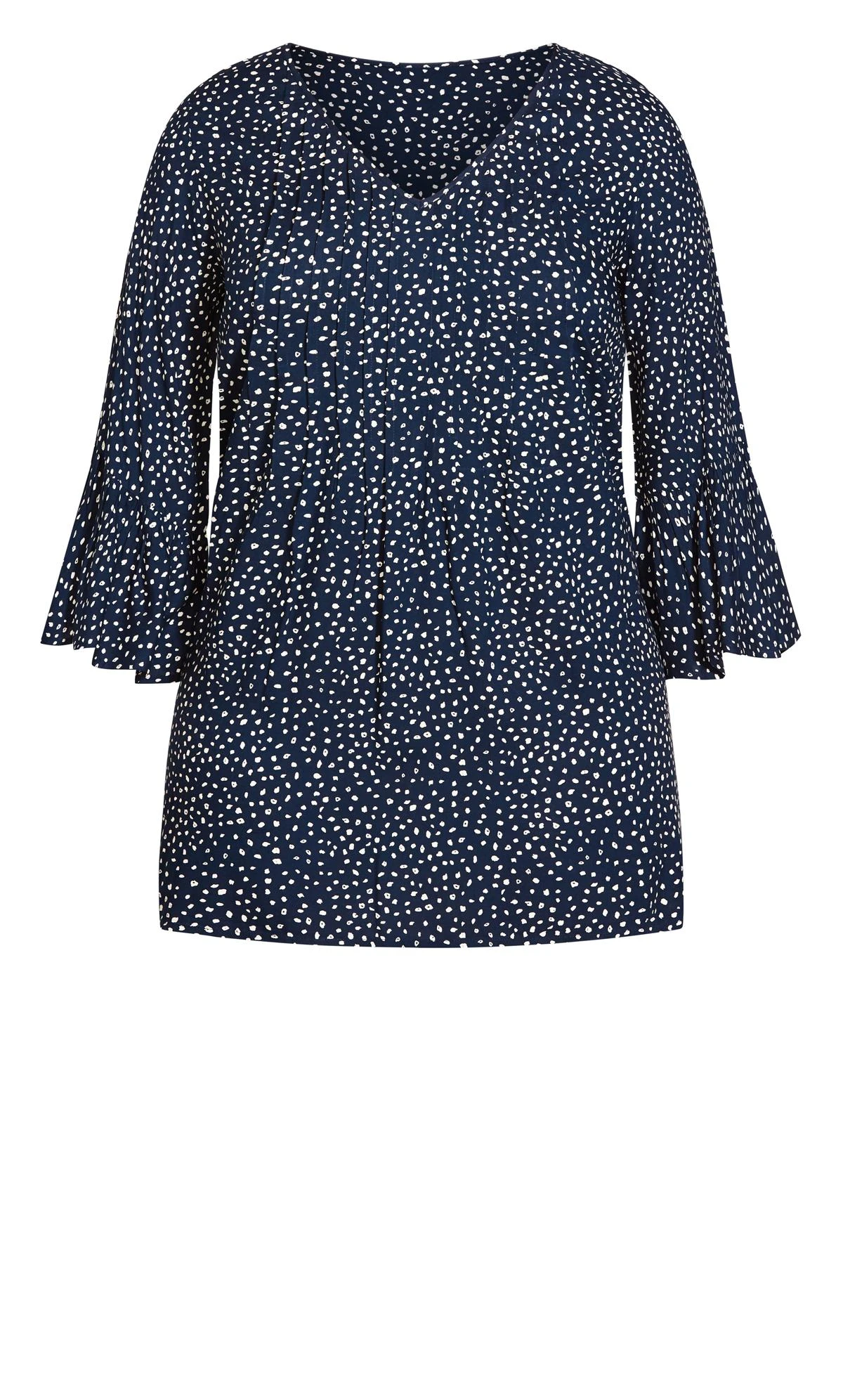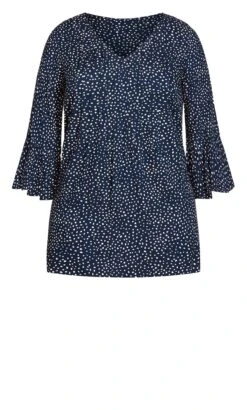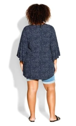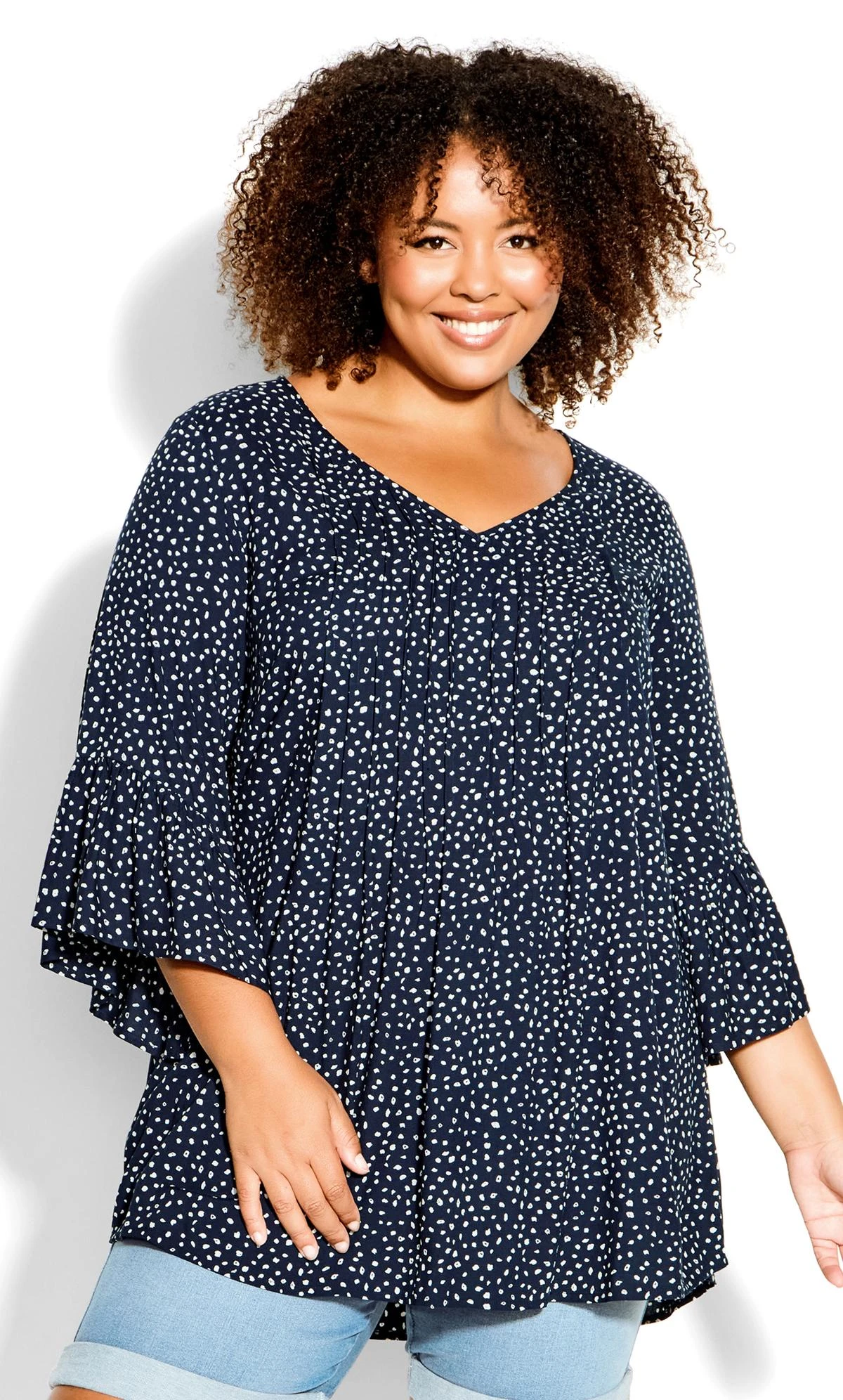 Add a touch of whimsy to your look with Avenue’s Navy Blue Spot Print Pintuck Top. This top effortlessly blends playful charm with sophisticated style, showcasing a navy blue spot print and delicate pintuck details that elevate its appeal. Whether paired with jeans or dressed up for an outing, embrace versatility and fashion-forward flair with this essential piece.