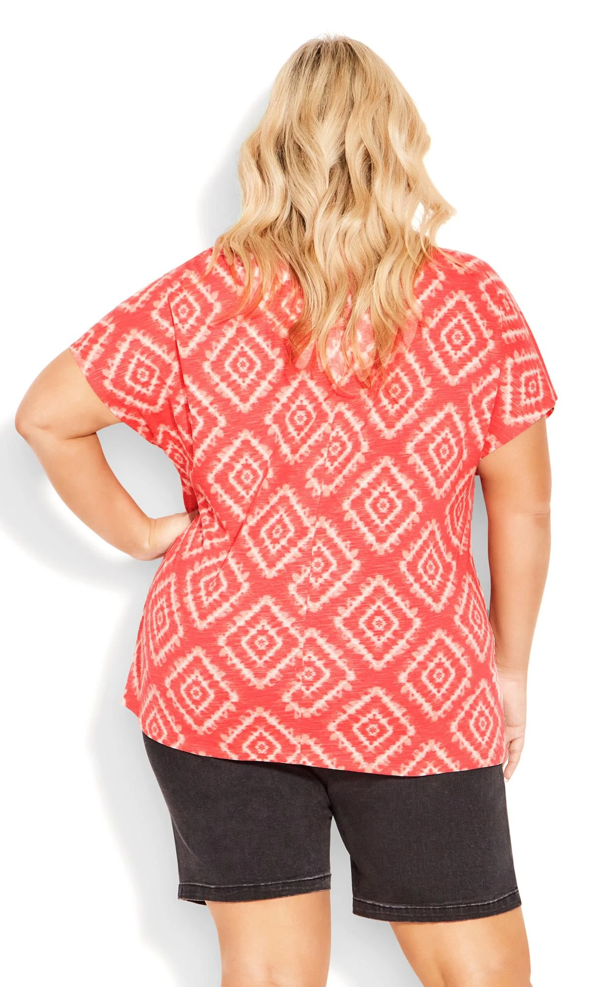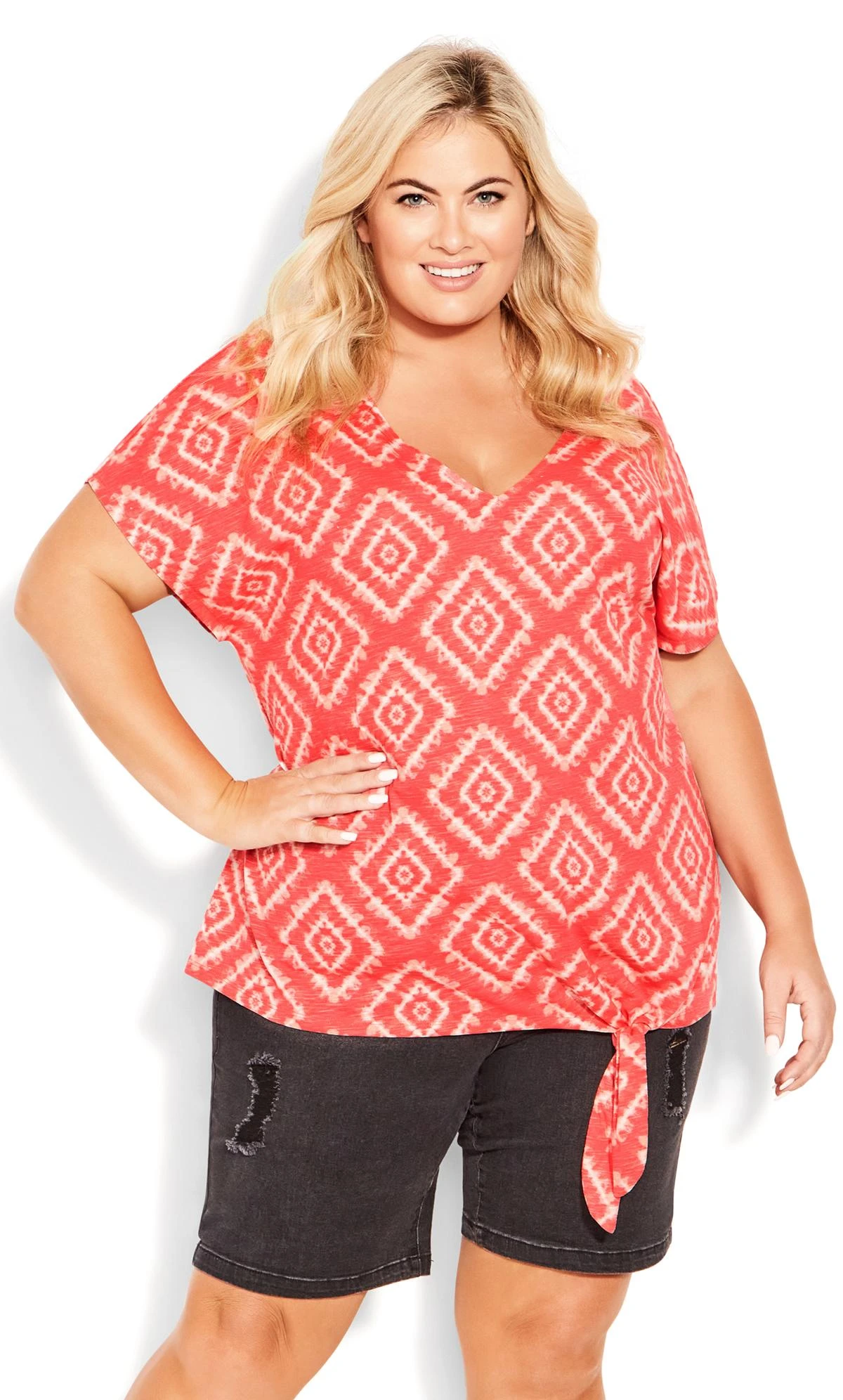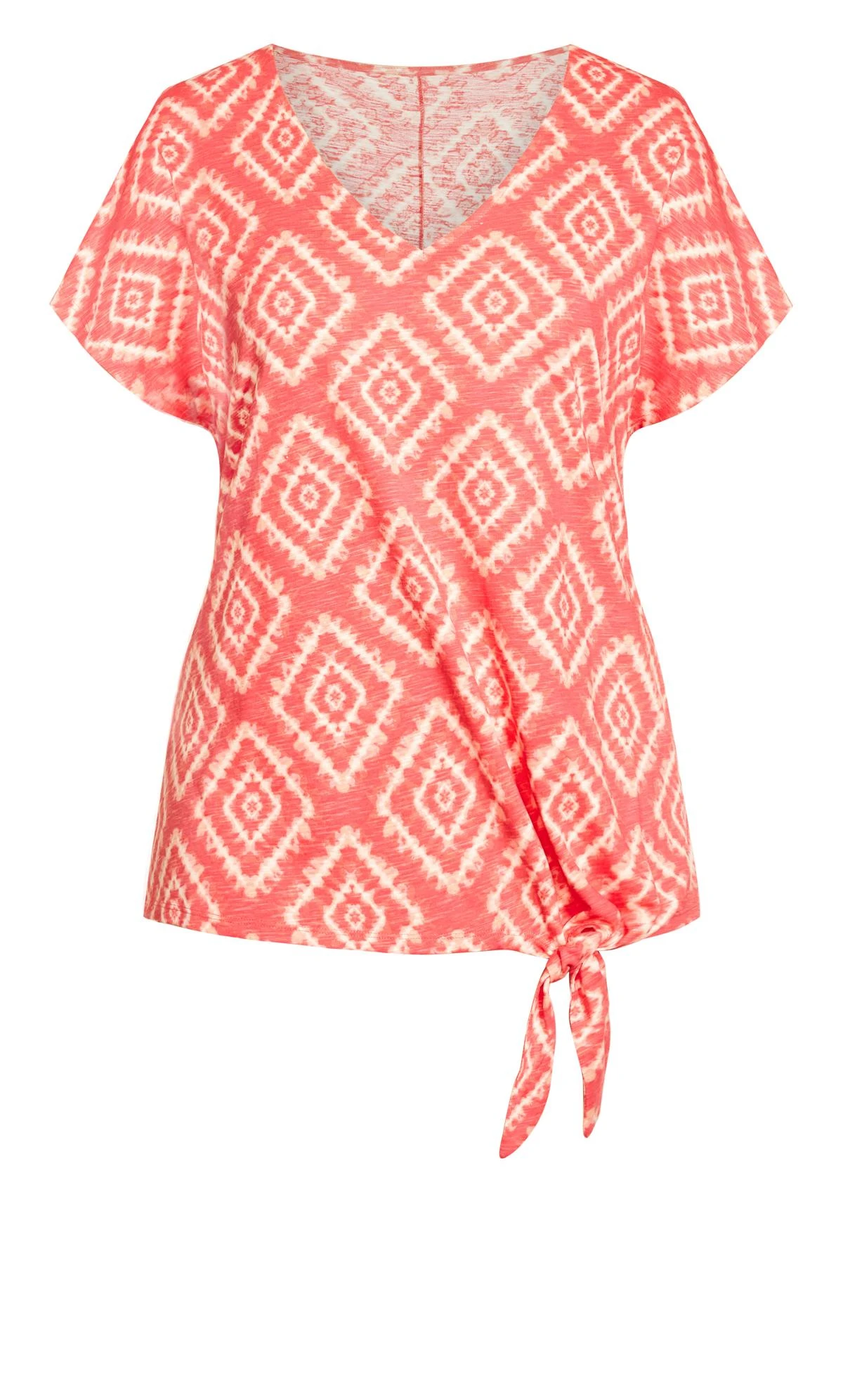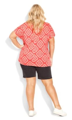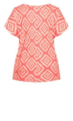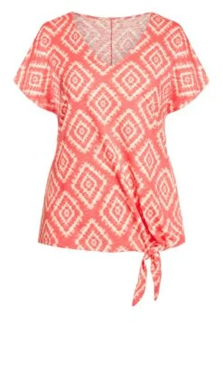 Discover contemporary fashion with our Avenue Orange Geometric Print Tie Hem T-Shirt. The vibrant orange hue combined with the chic geometric design creates a captivating and modern look. The unique tie hem adds a playful twist to the classic t-shirt, making it a versatile and stylish addition to your wardrobe.