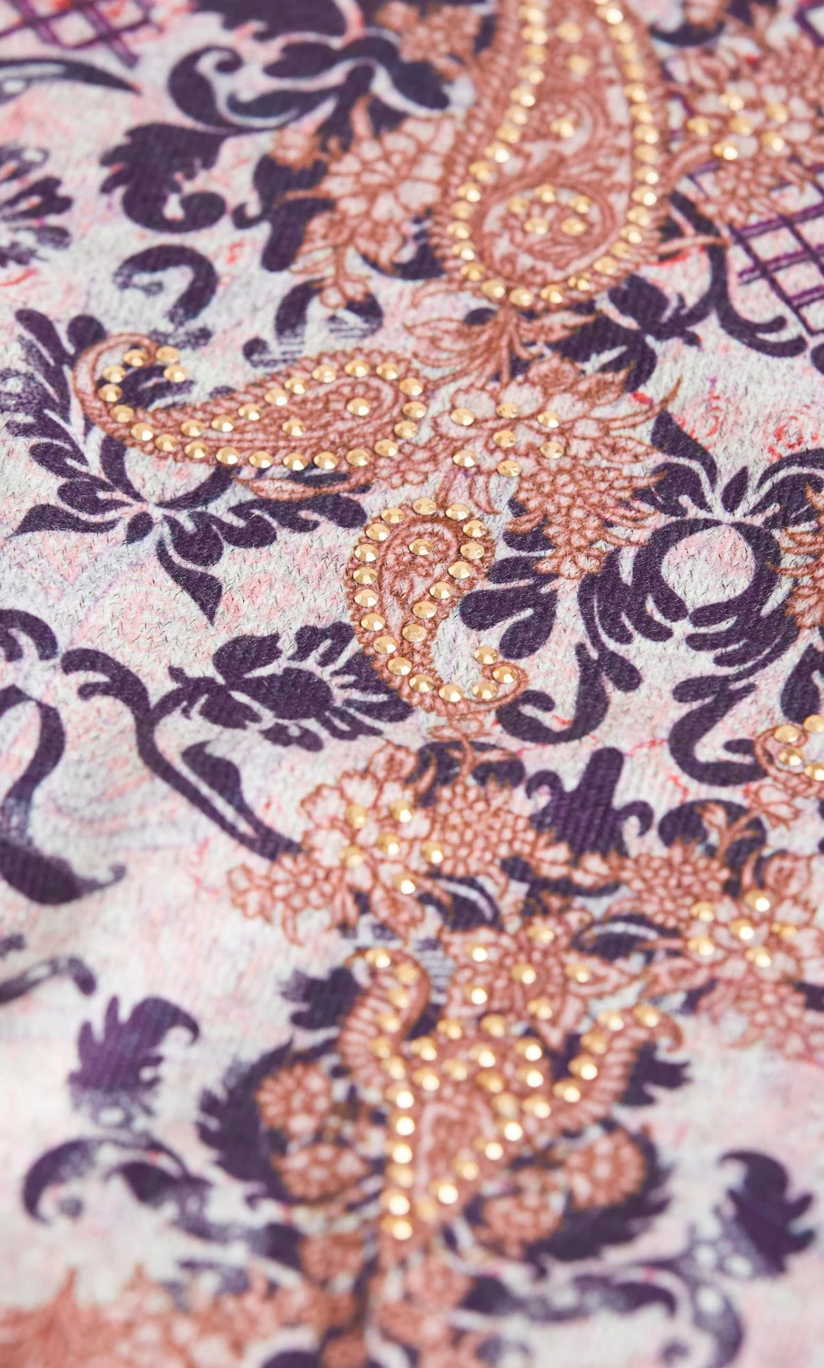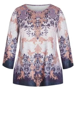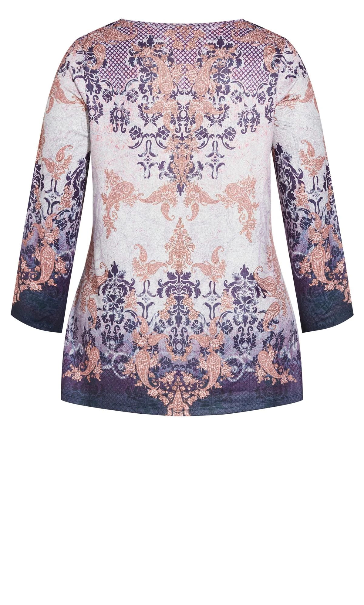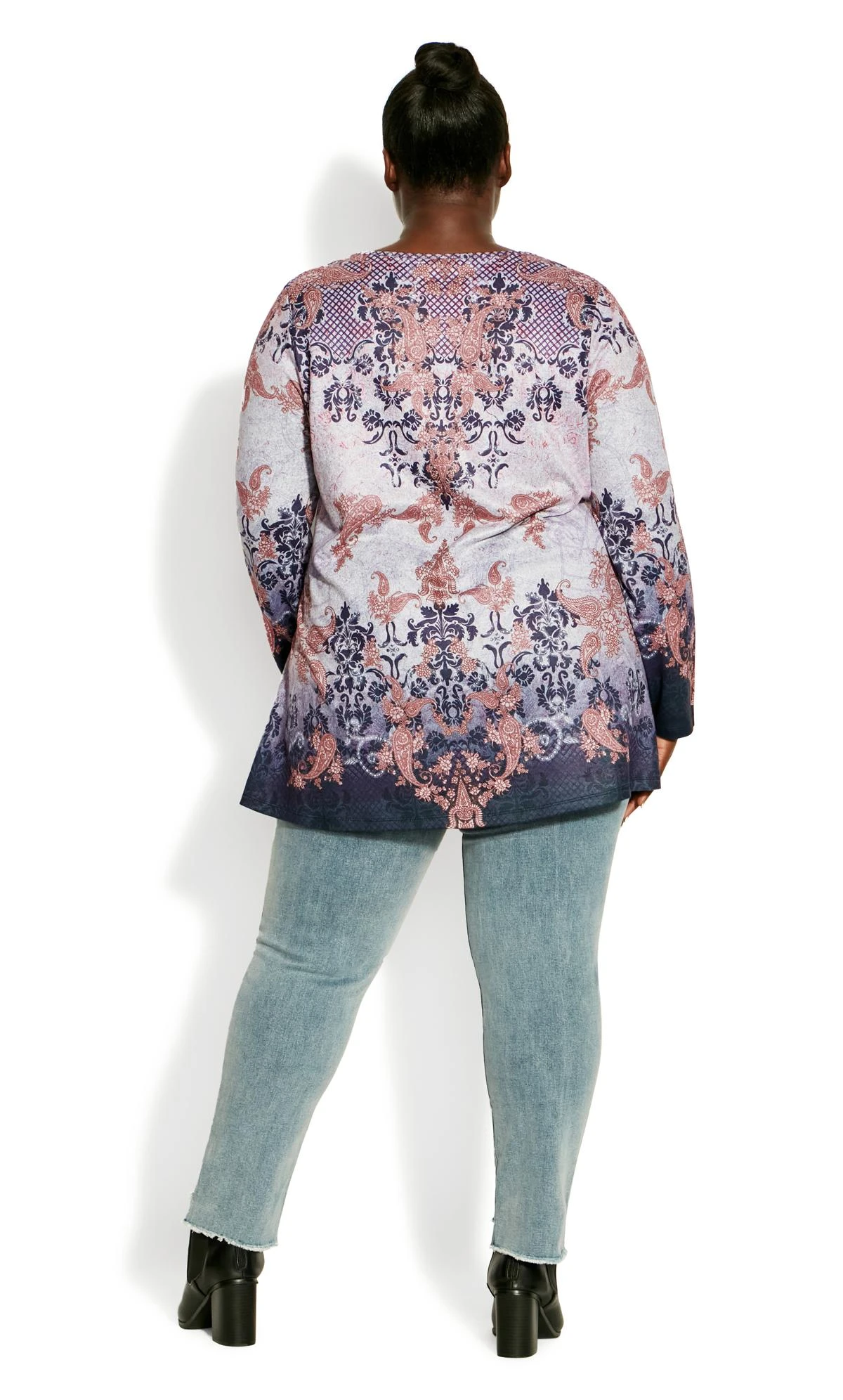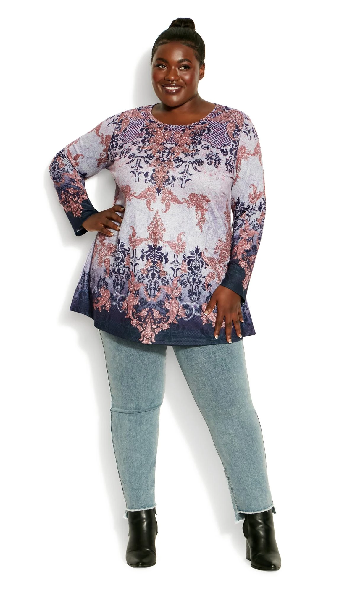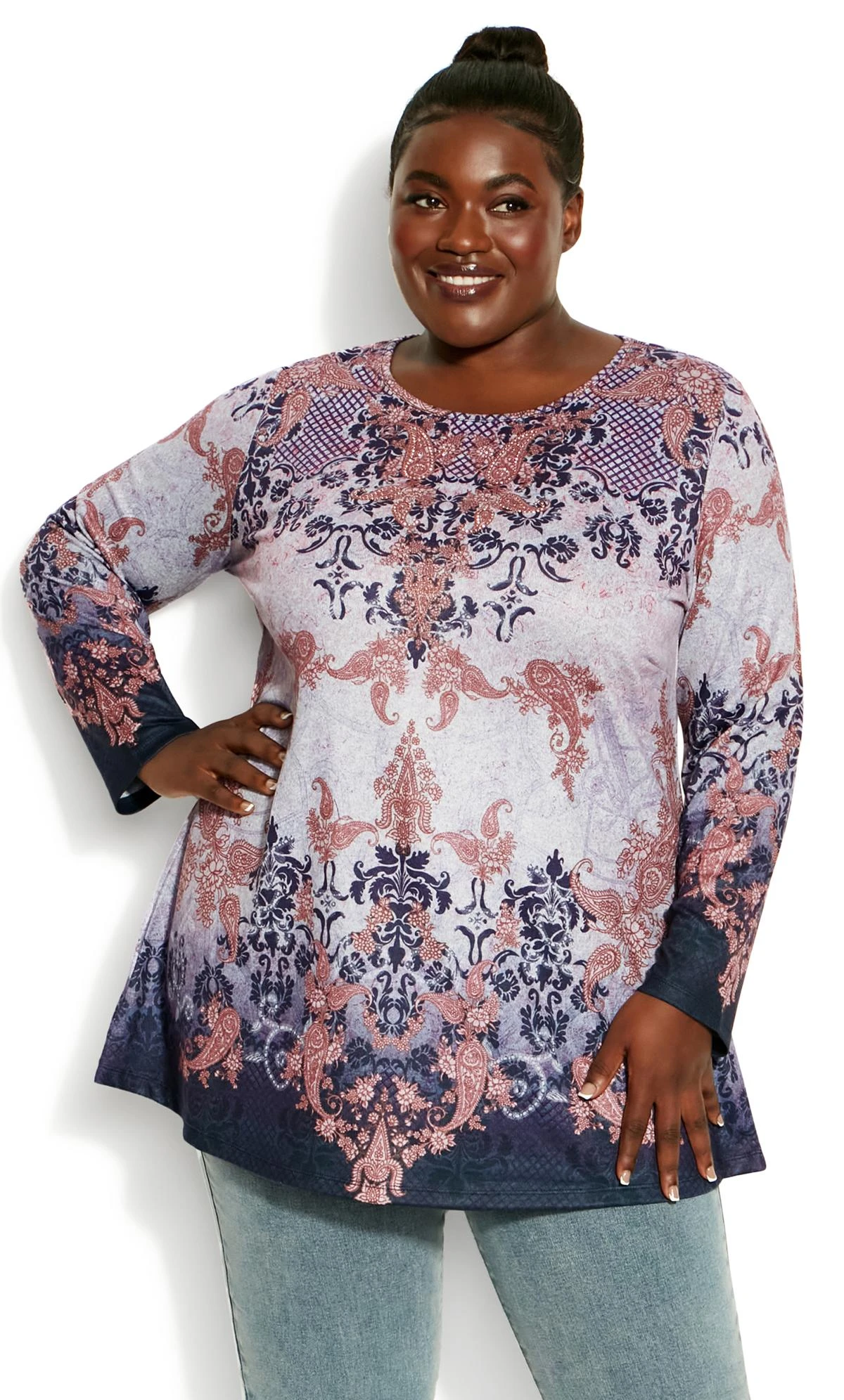 Embrace bohemian beauty with the Avenue Purple Paisley Print Long Sleeve Swing Top. This top effortlessly combines comfort and style, featuring a captivating paisley print in rich purple tones. The swing silhouette offers a relaxed fit, making it a perfect choice for both casual days and chic evenings out, allowing you to express your unique flair with confidence.
