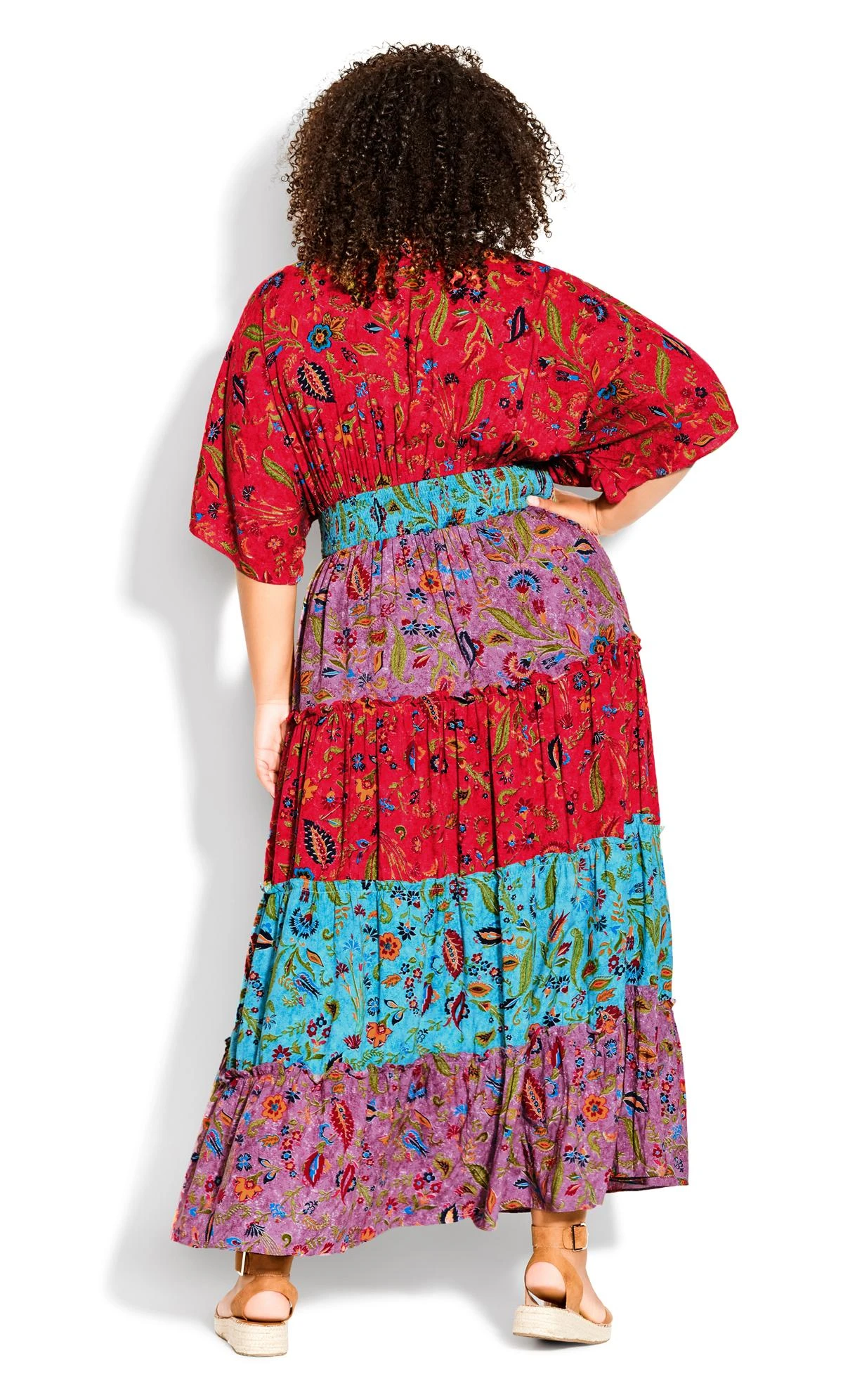 This bright dress gets some balance with a pair of tan sandals.