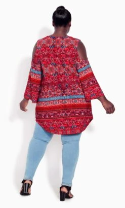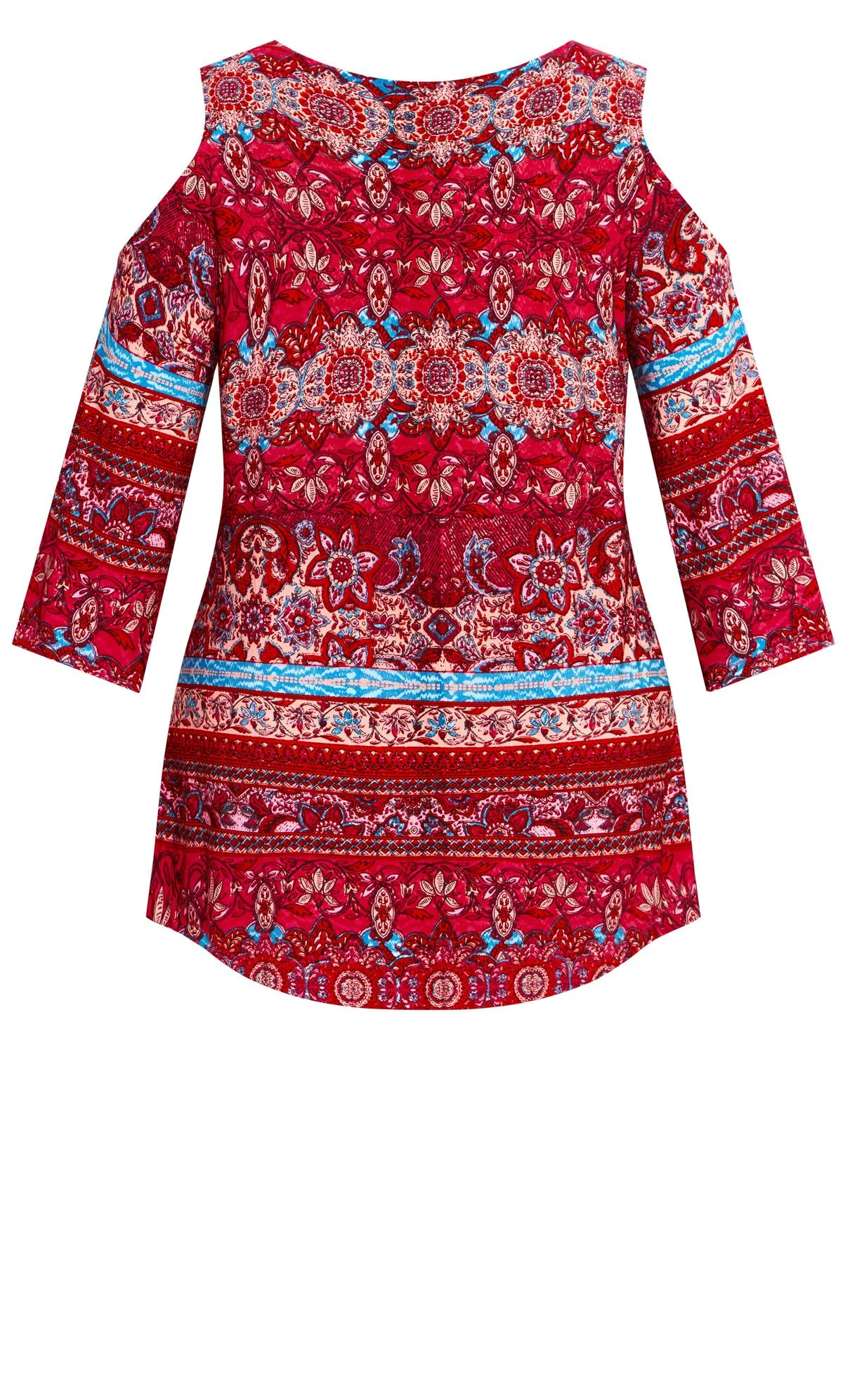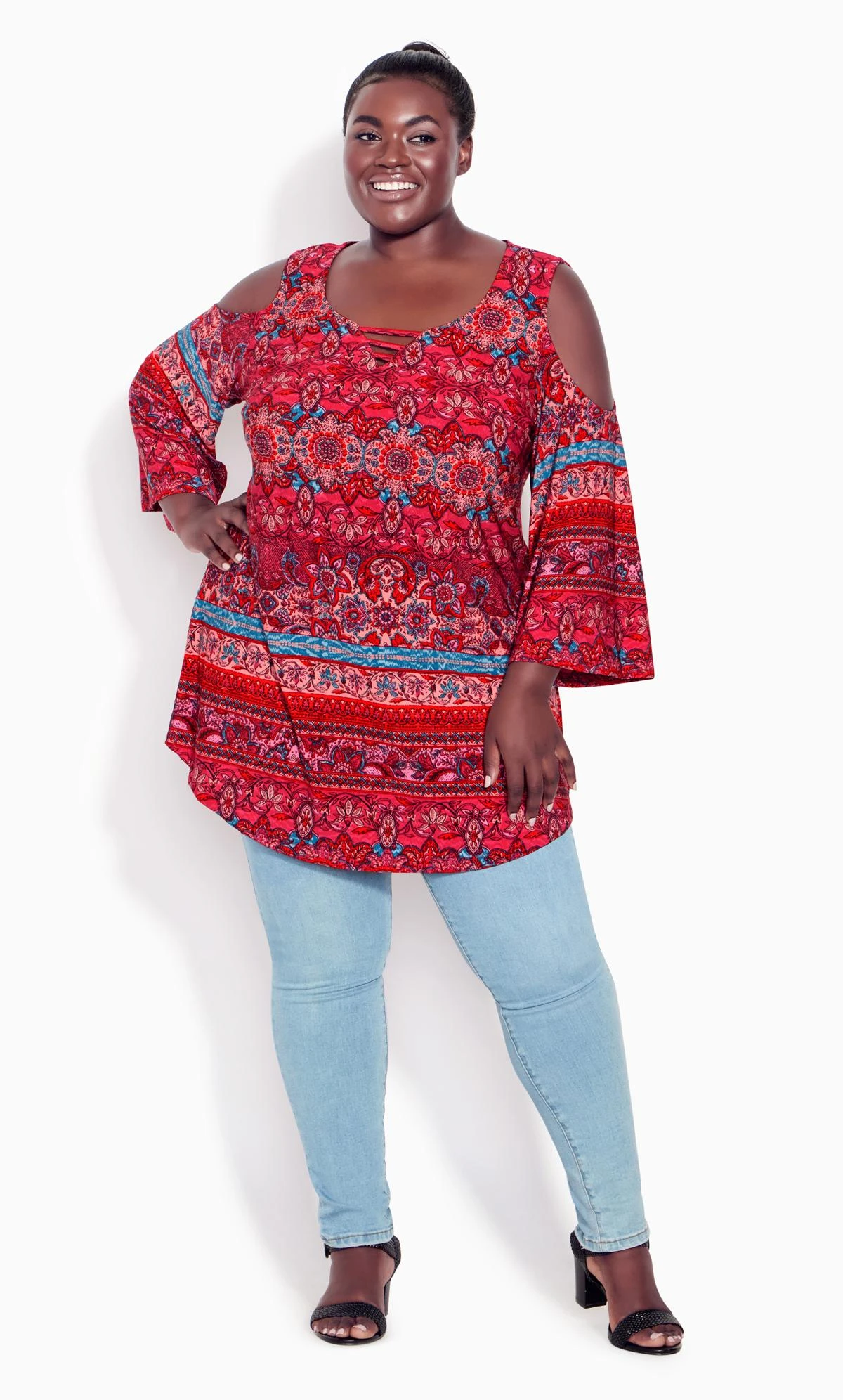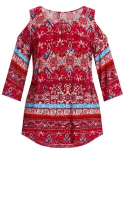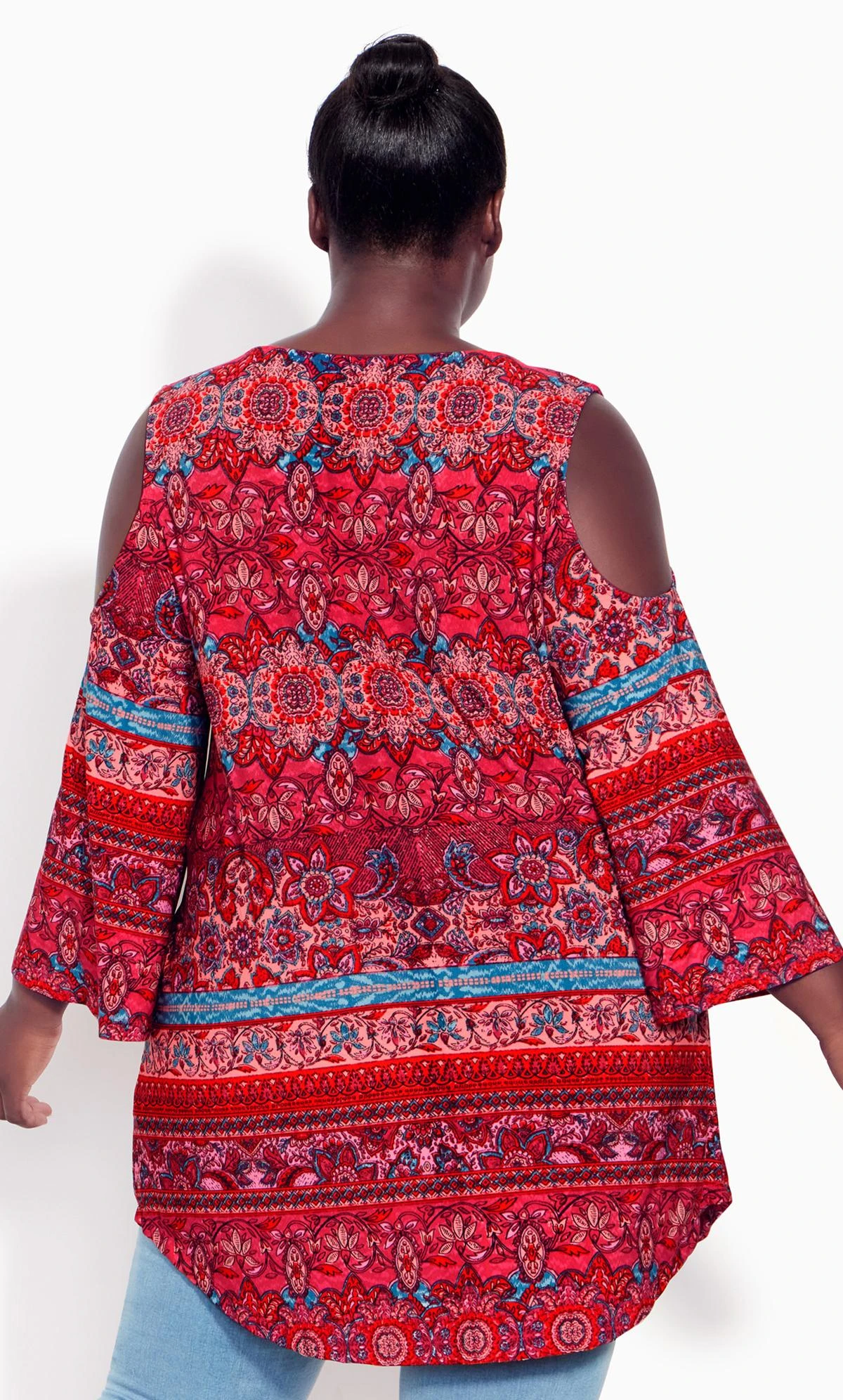 Infuse your outfit with boho charm through the Avenue Red Paisley Cold Shoulder Top. The vibrant red hue and intricate paisley pattern create a captivating look. With cold shoulder cutouts, this top seamlessly combines style and comfort, making it a versatile addition to your wardrobe for expressing your unique fashion sense.