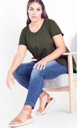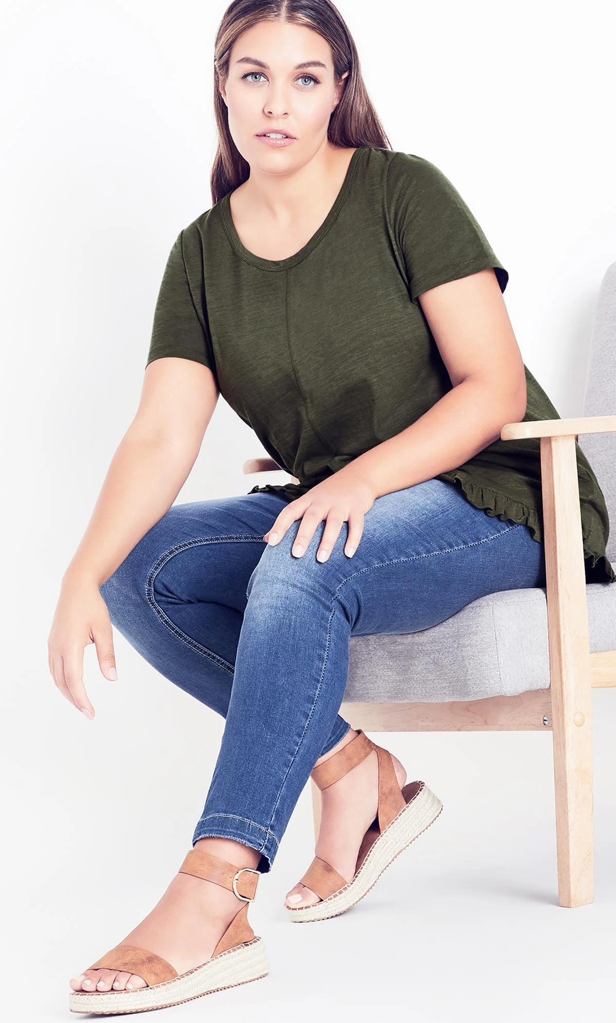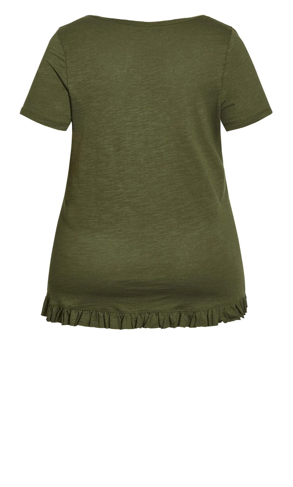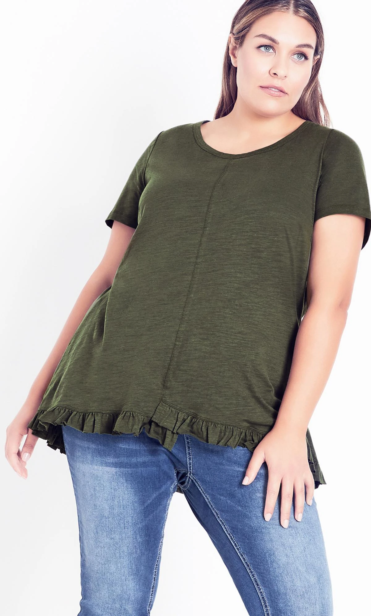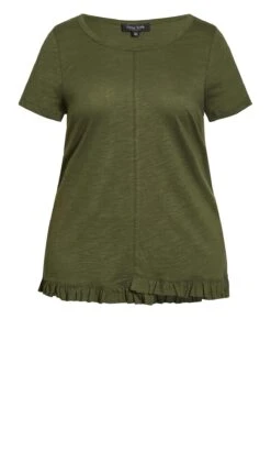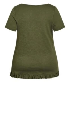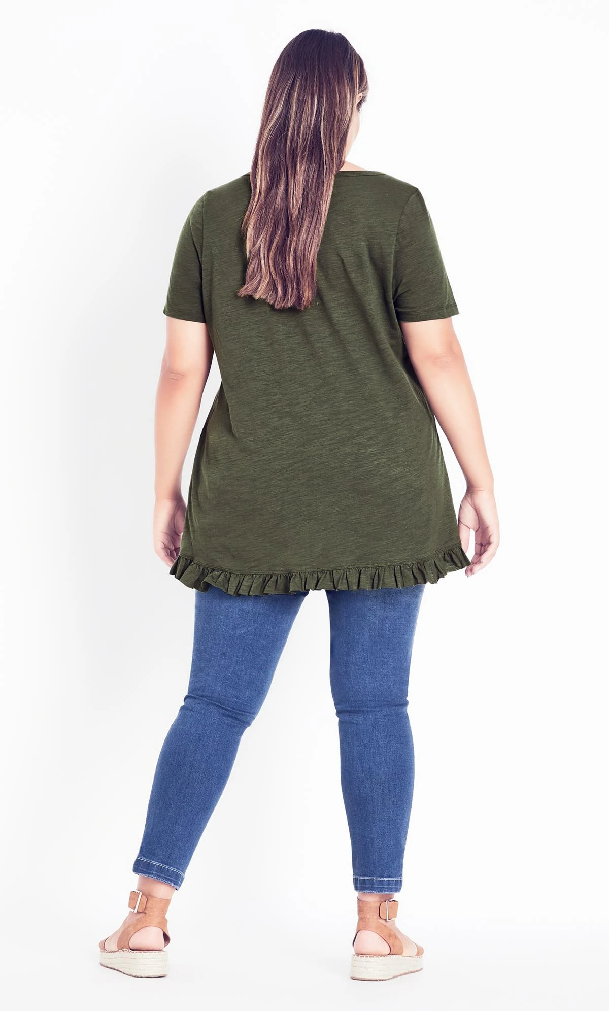 Make everyday style amazing in the Mae Ruffle Top. This olive green piece is a versatile essential with its soft Cotton fabrication and asymmetrical ruffle hemline.