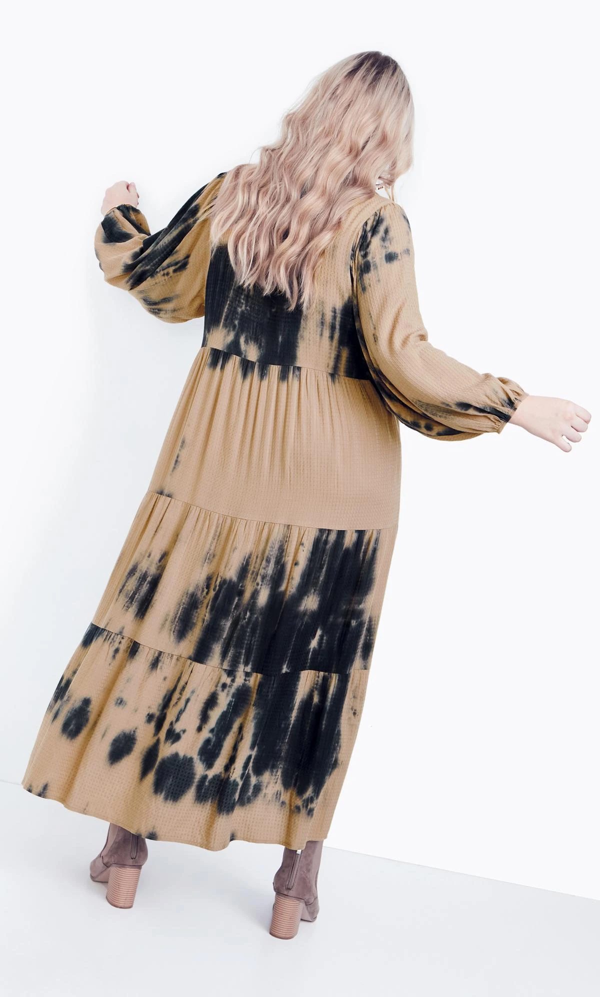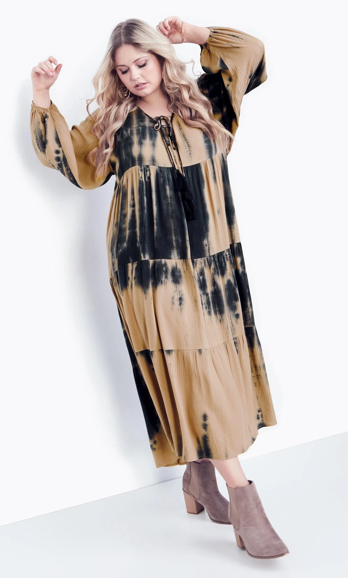 For a totally relaxed sense of chic, go with the flow in the Catrine Tie Dye Maxi Dress. The tiered maxi skirt floats over your curves for a dreamy finish with full-length sleeves and a tassel tie neckline.
