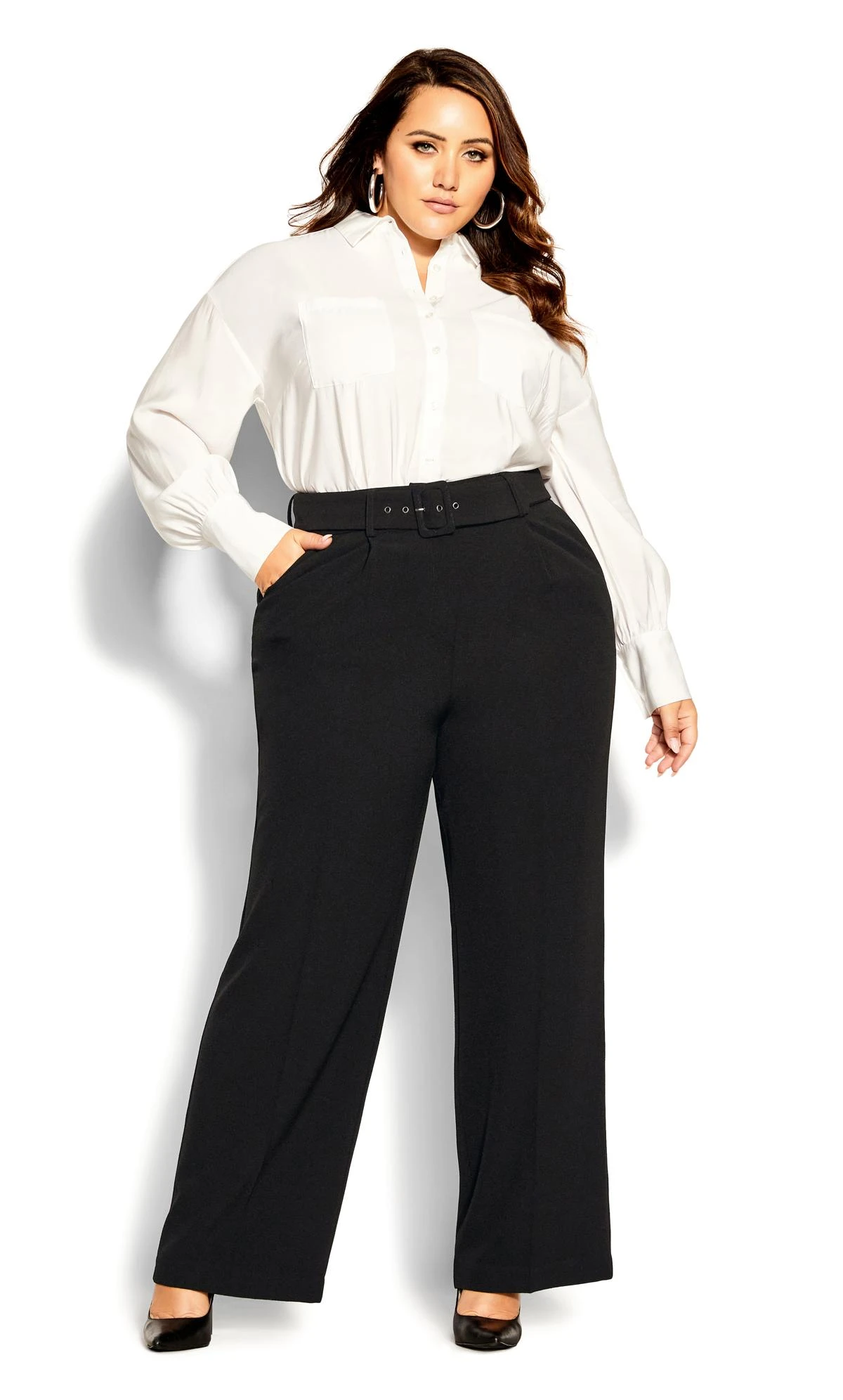 Step into bold sophistication with the City Chic Black Belted Wide Leg Trousers. The classic black hue exudes timeless charm, while the belted detail adds a touch of modernity. Perfect for a chic and stylish look, these wide-leg trousers effortlessly blend fashion and comfort, ensuring you radiate confidence and flair in any setting.