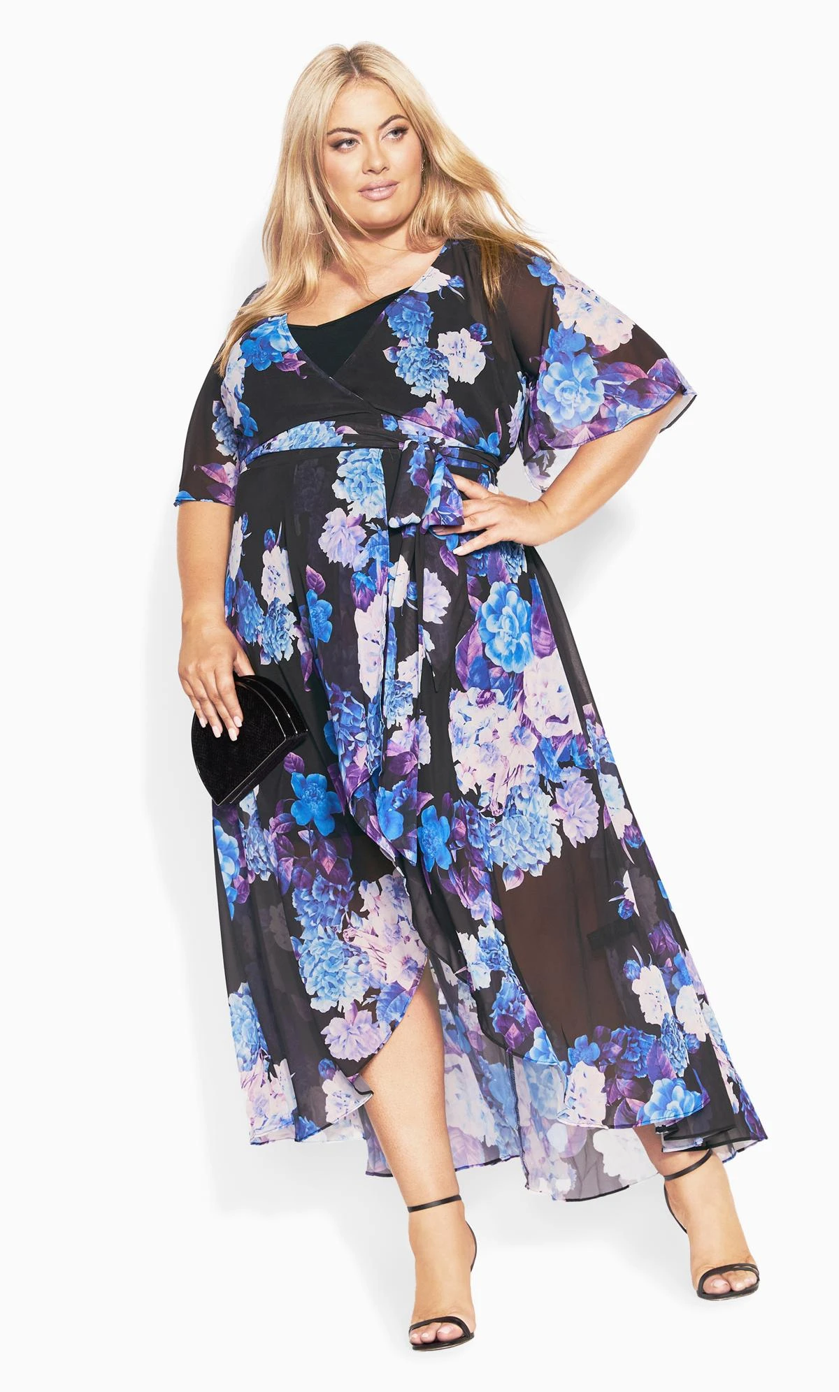 The City Chic Black Hydrangea Patterned Wrap Maxi Dress encapsulates timeless beauty with a modern twist. Its flattering wrap design accentuates the waist and offers a customized fit, while the delicate black hydrangea pattern adds a touch of romance to the ensemble. This dress is a versatile choice, seamlessly transitioning from daytime elegance to evening allure.