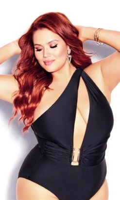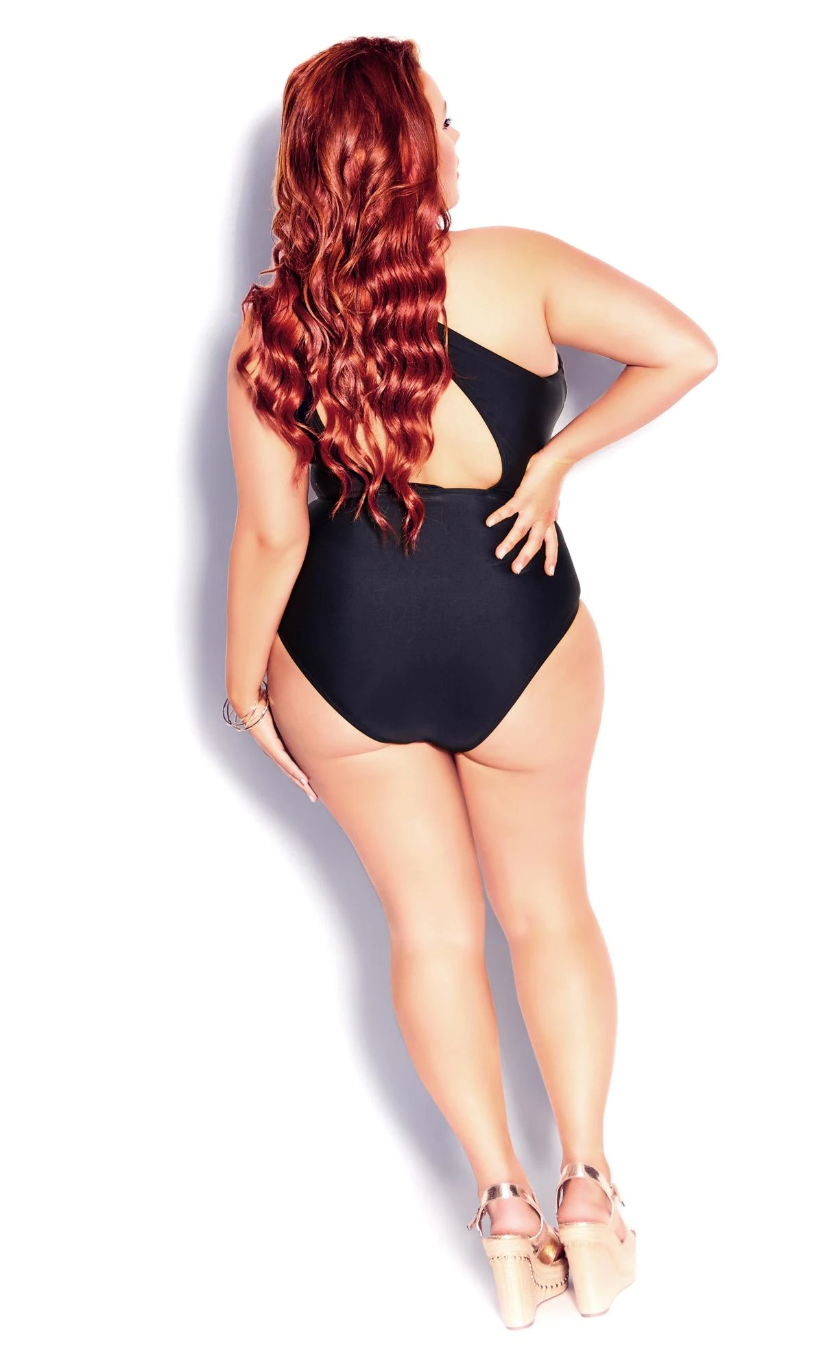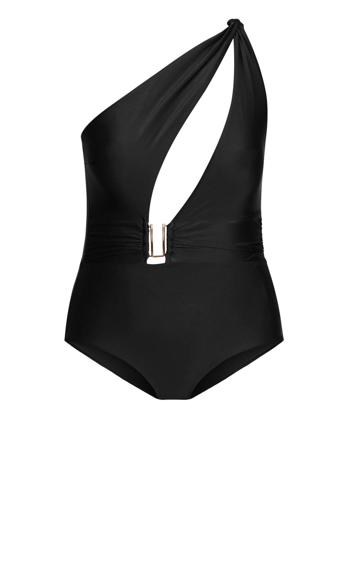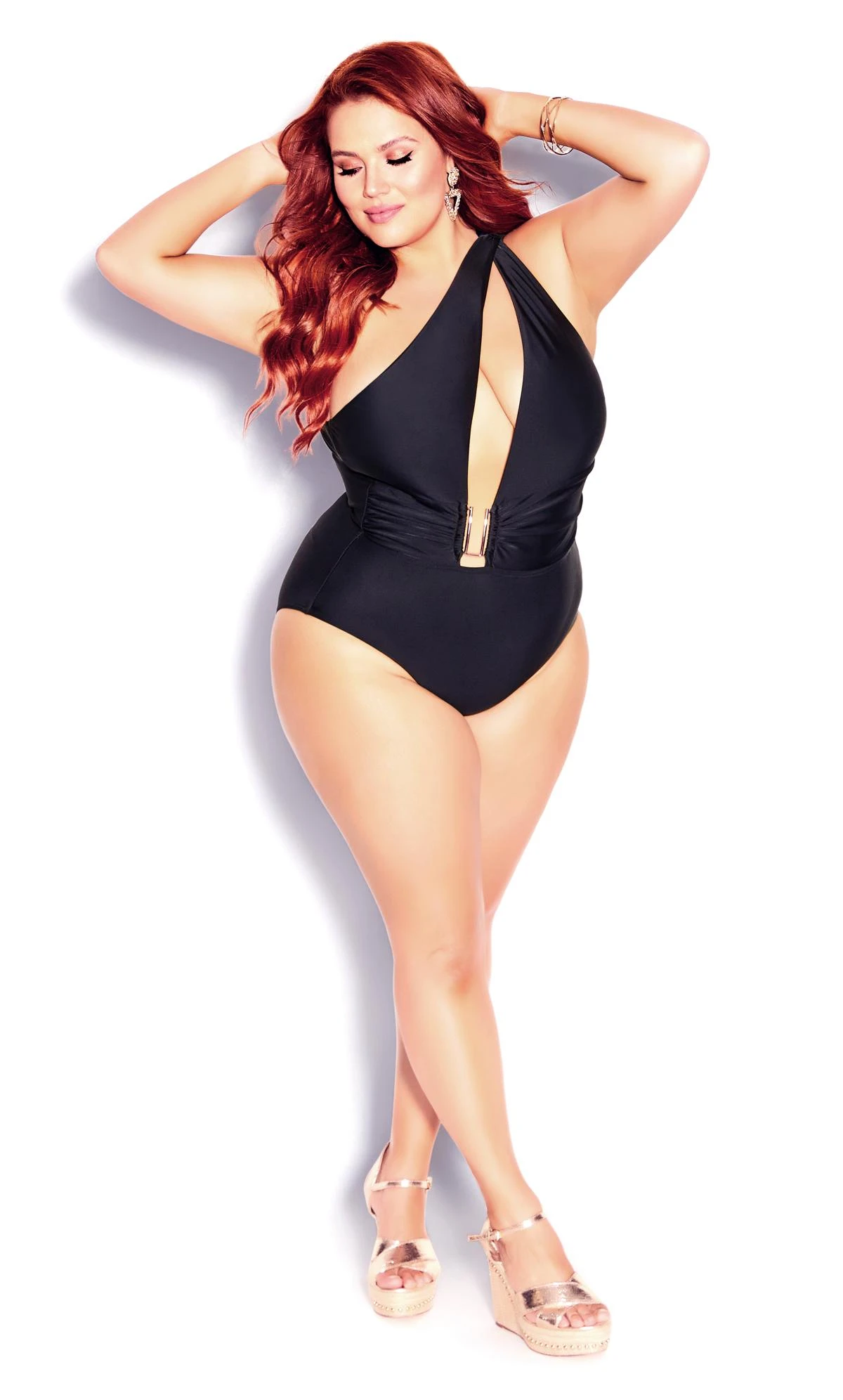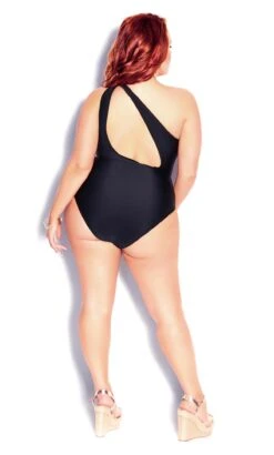 Make a statement at the beach or poolside with the City Chic Black One Shoulder Swimsuit. With its alluring plunge neckline, this swimsuit effortlessly combines elegance and daring style. The sleek black design and one-shoulder detail create a captivating look that’s perfect for confident fashionistas seeking a unique swimwear experience.