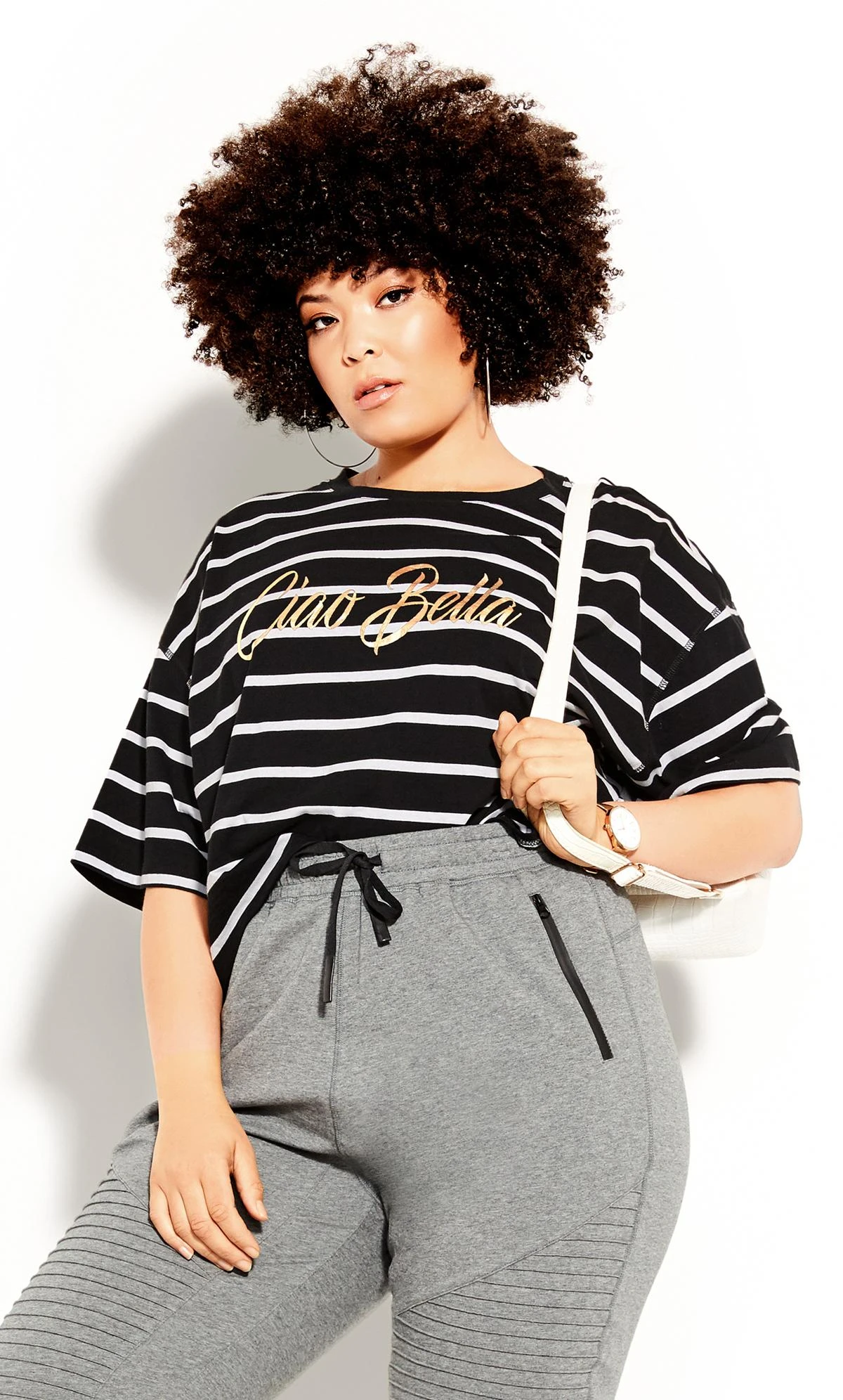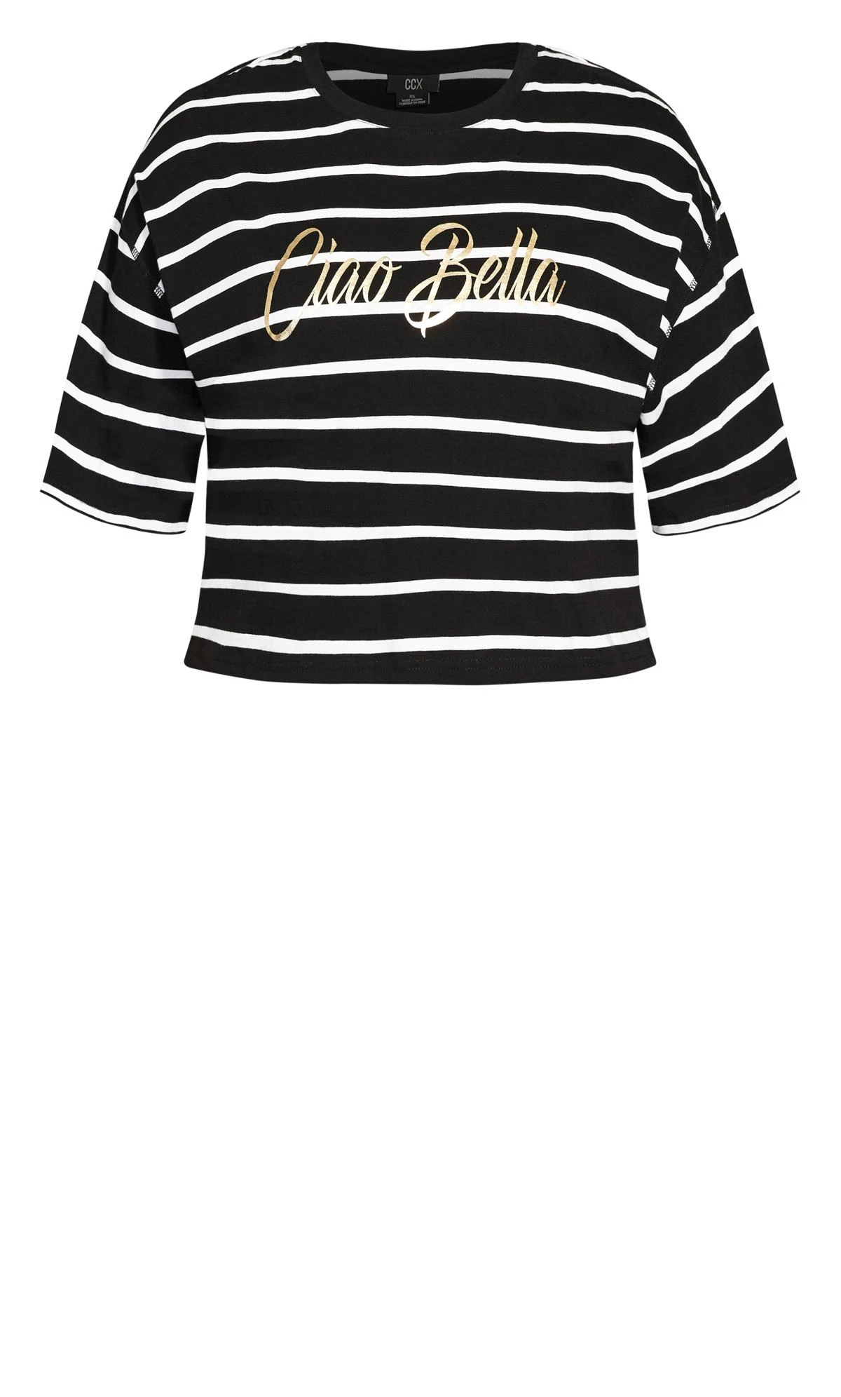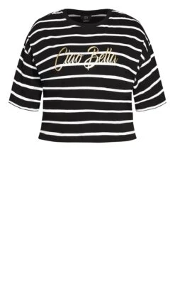 This effortlessly stylish tee from City Chic boasts bold stripes and a “Ciao Bella” print, making it the perfect blend of classic design and contemporary charm. Made with soft, breathable fabric, it promises both comfort and a statement, whether you’re sipping espresso at a café or strolling through city squares.