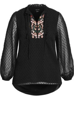 Bring your style game wherever you go with the eye-catching Tayla Top. This classy top features sheer full length sleeve with elasticated cuffs, ruffle neck trim and finished with a high neckline self-tie design with embroidered detail.