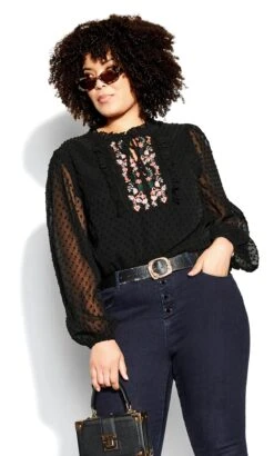 Bring your style game wherever you go with the eye-catching Tayla Top. This classy top features sheer full length sleeve with elasticated cuffs, ruffle neck trim and finished with a high neckline self-tie design with embroidered detail.