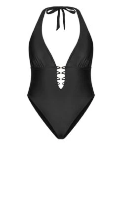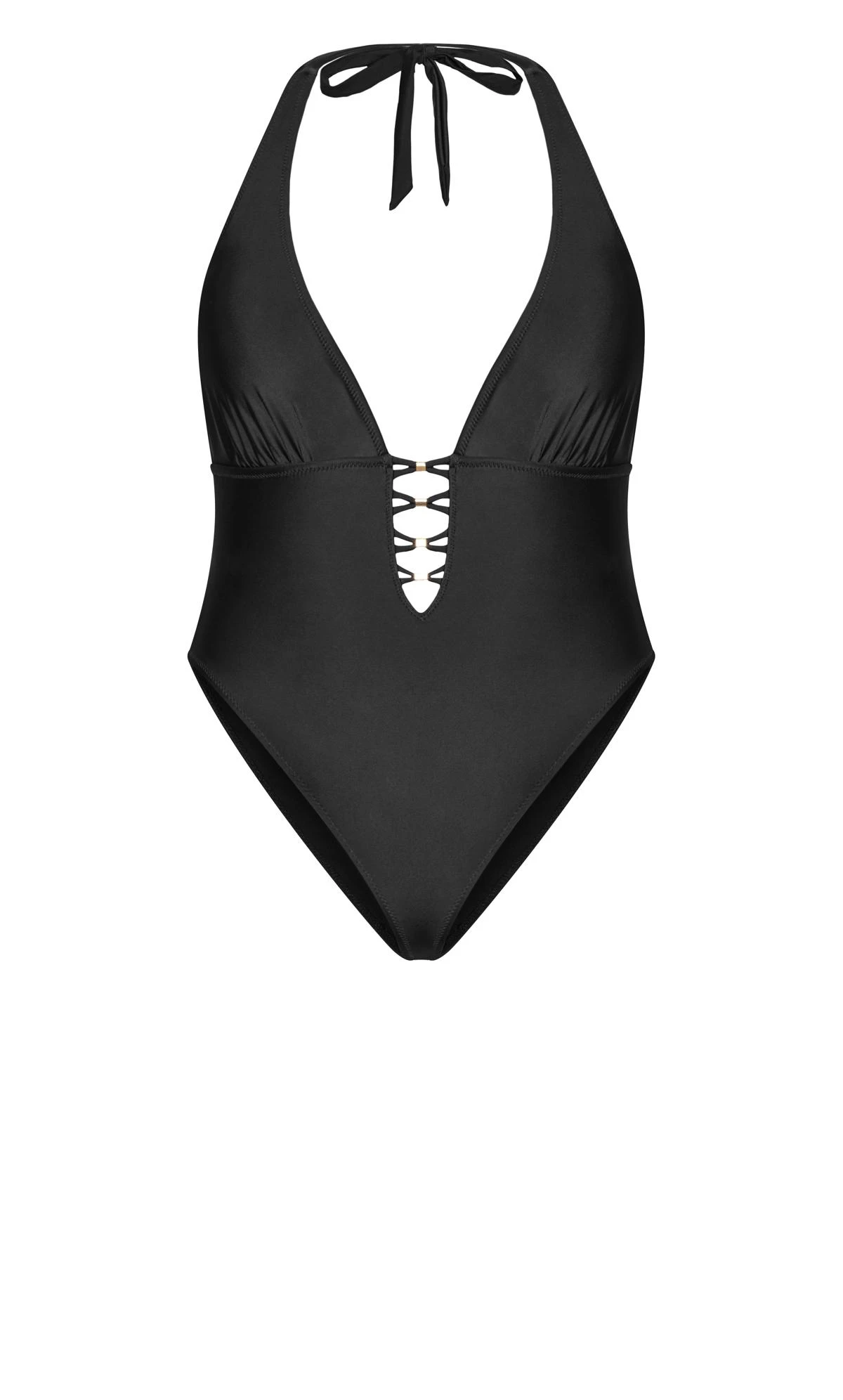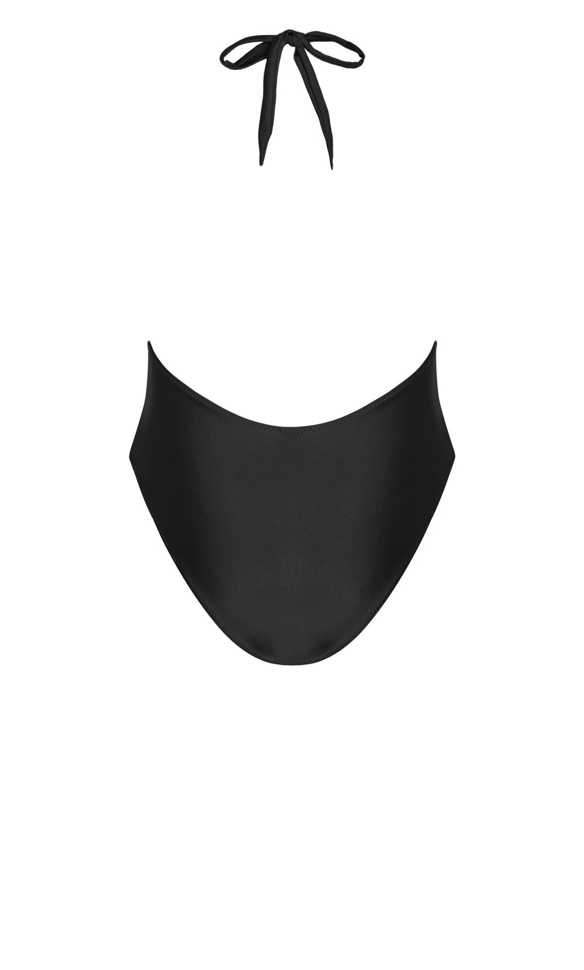 Go get ’em in Gidget! Complete with a halter neck strap, low back, plunging bust and glossy gold hardware, this figure-flattering swimsuit will have you looking like the most glam babe on the beach.