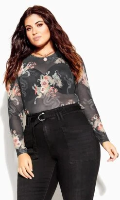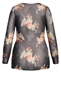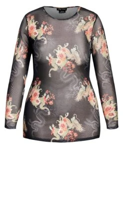 Layer up or dare to bare! The Mesh Dragon Top is comfort fashion trending styling at it’s best. Showcasing a high-rounded neckline with long sleeves and a hip-length hemline, this top is an elegant and sexy must-have.