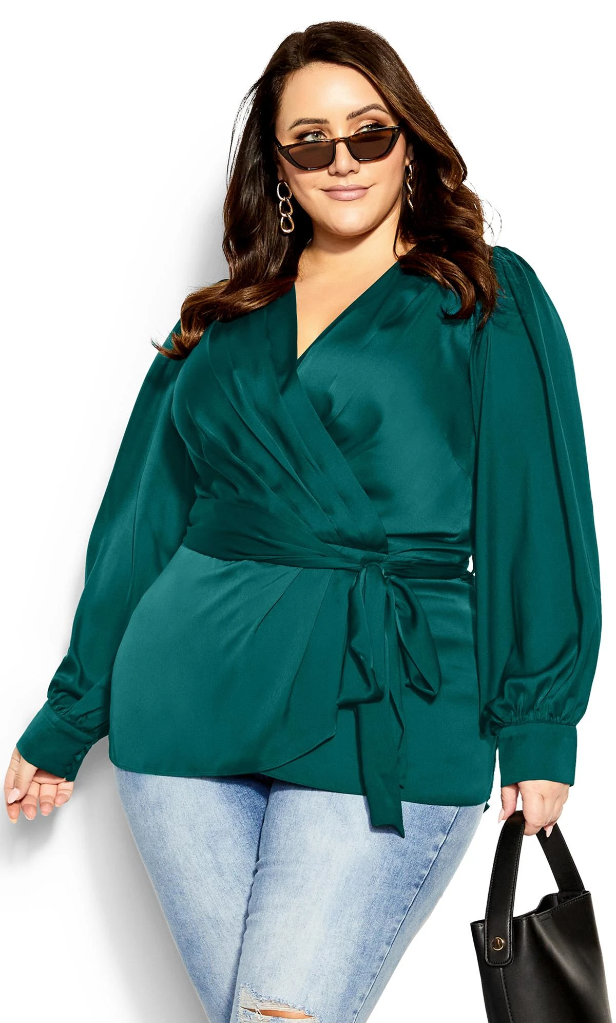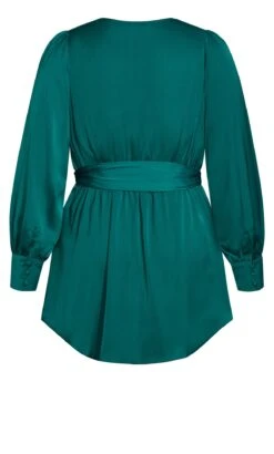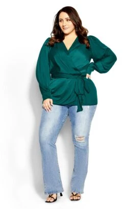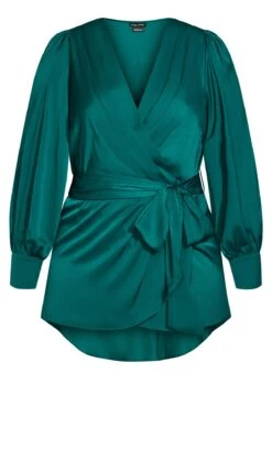 Unveil opulent elegance in the City Chic Jade Green Satin Wrap Top. Luxuriously draped in lustrous satin, this wrap top captivates with its rich emerald hue. From special occasions to chic gatherings, its versatile style effortlessly exudes sophistication, making it a wardrobe essential for those seeking a striking and timeless look.