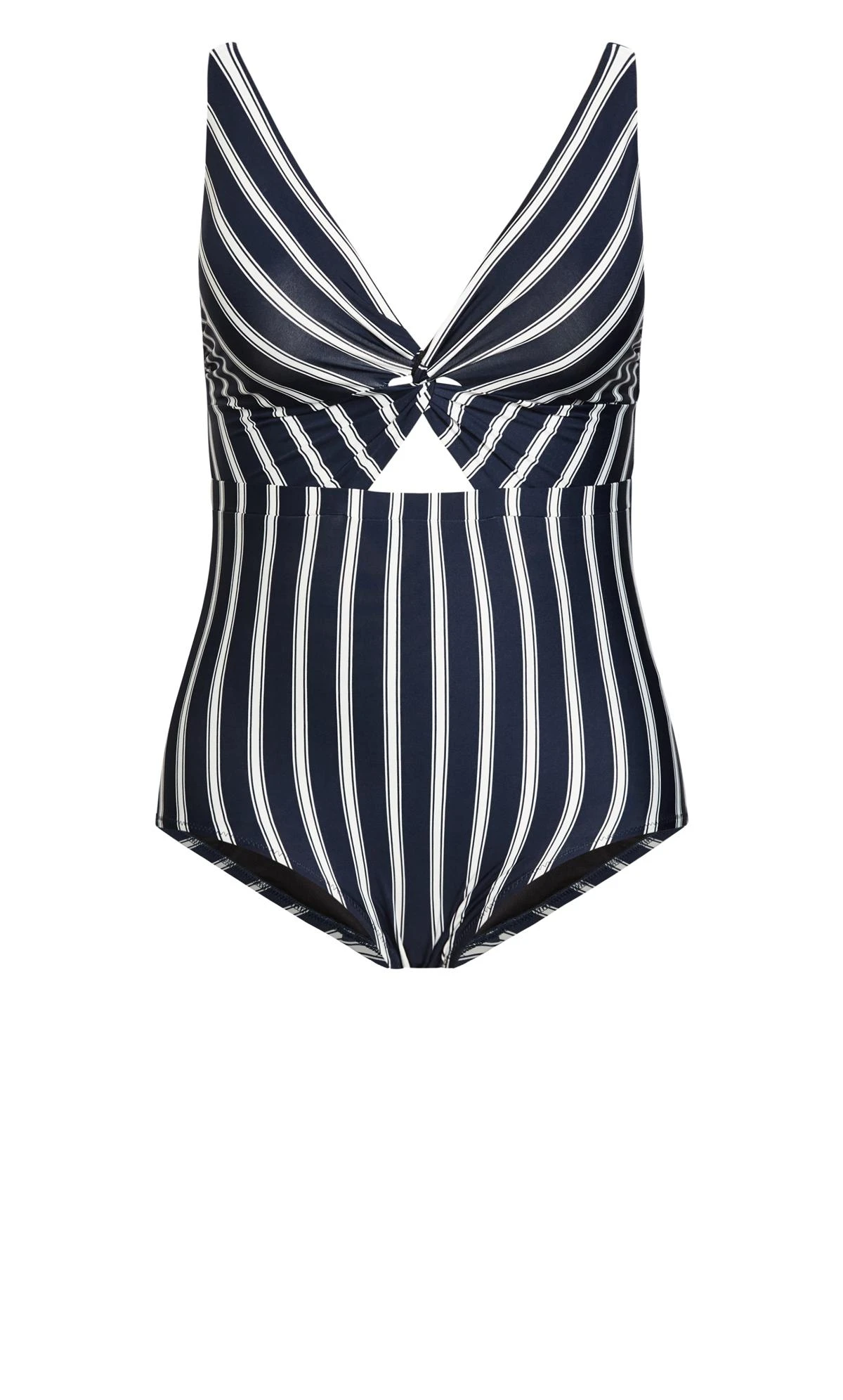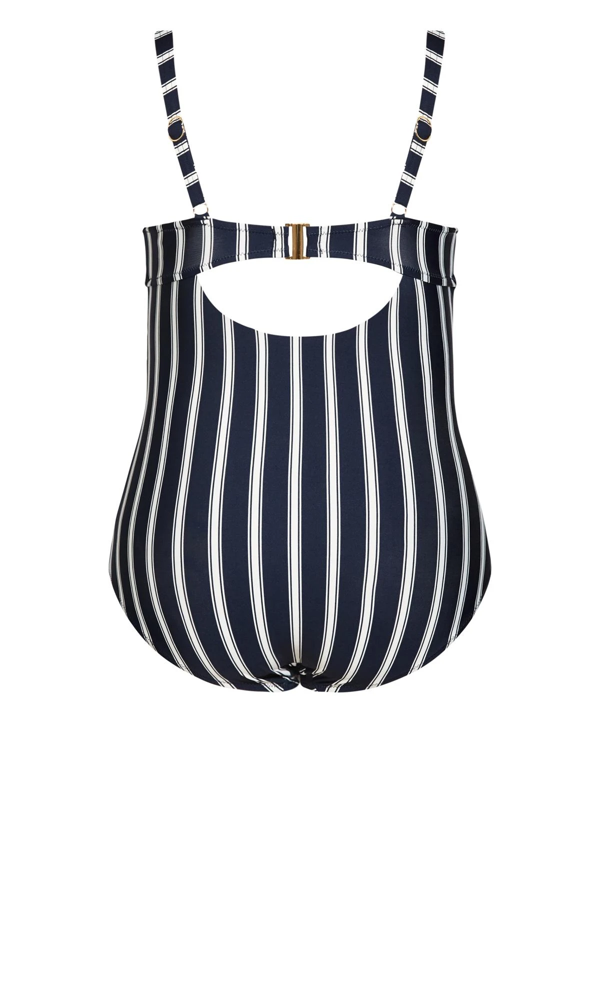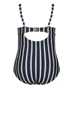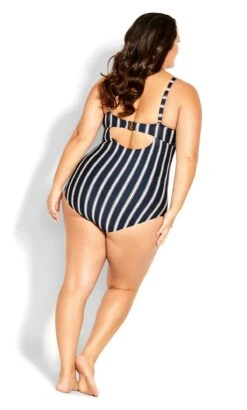 Elevate your swimwear with City Chic’s Navy Blue Stripe Cut Out Swimsuit. This swimsuit effortlessly combines charm with a captivating navy blue stripe design and chic cut-out detailing. Whether for beach days or poolside lounging, make a fashionable splash with this essential swimwear piece that embodies both style and allure.