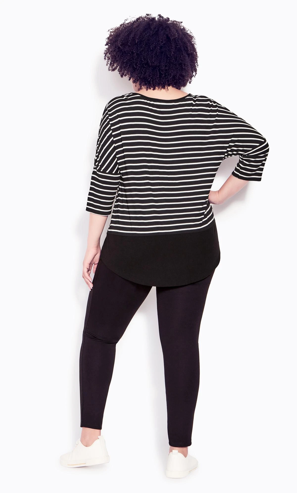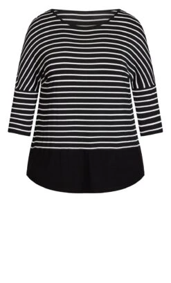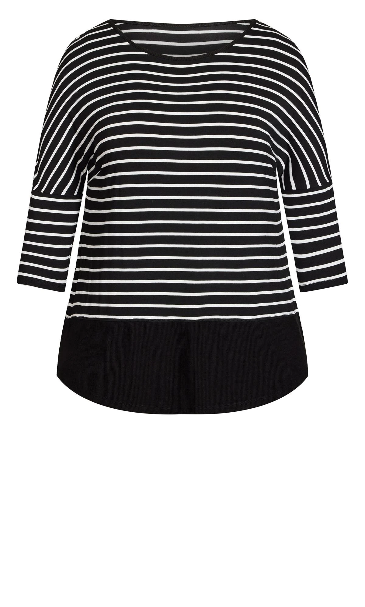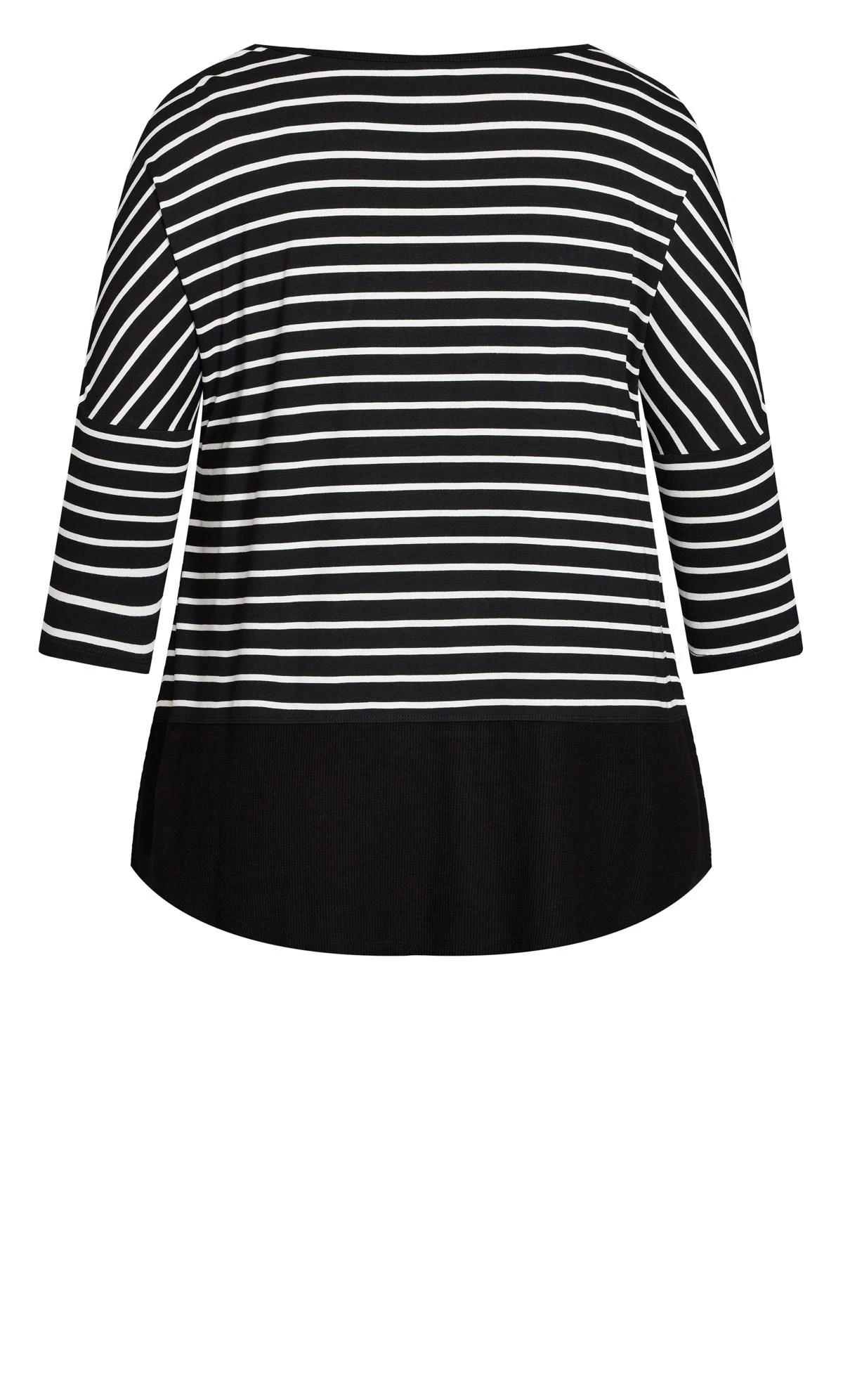 Look chic in the easy comfort of the black Rib Stripe Top. Finished with a contrast trim hemline, this top adds a layered feel to your everyday wardrobe with its soft ribbed fabrication and timeless striped design.