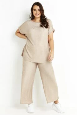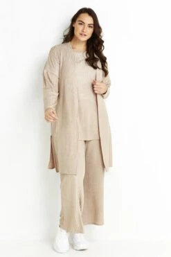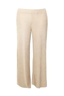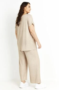 Elevate your wardrobe with the Evans Beige Lurex Ribbed Wide Leg Trousers, a perfect balance of comfort and glamour. These trousers feature a ribbed texture with a touch of lurex for added sparkle, offering a unique style. Create a chic and trendy outfit by pairing them with a tucked-in blouse and heels, making a fashion-forward statement at any event or evening outing.