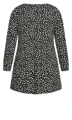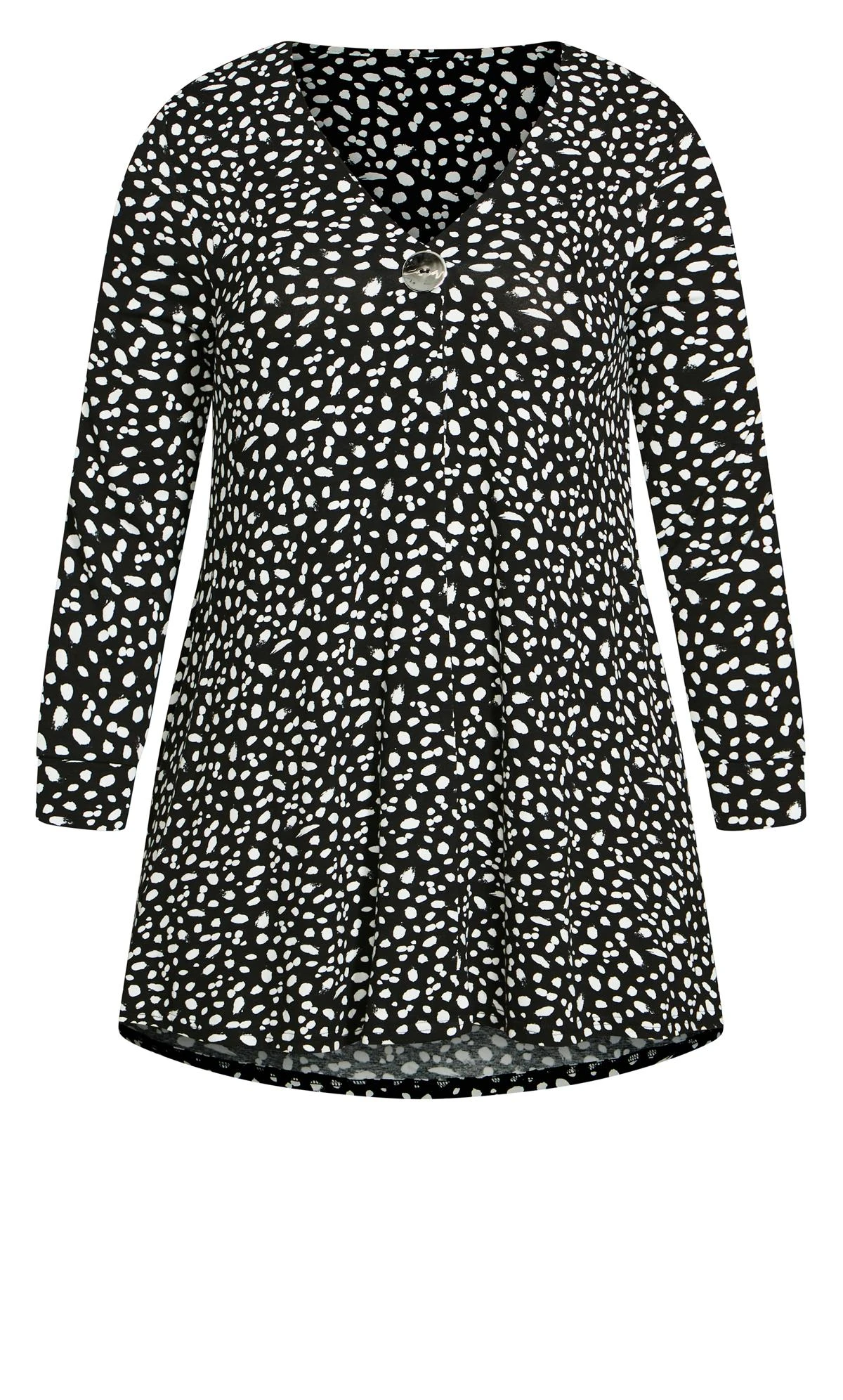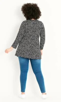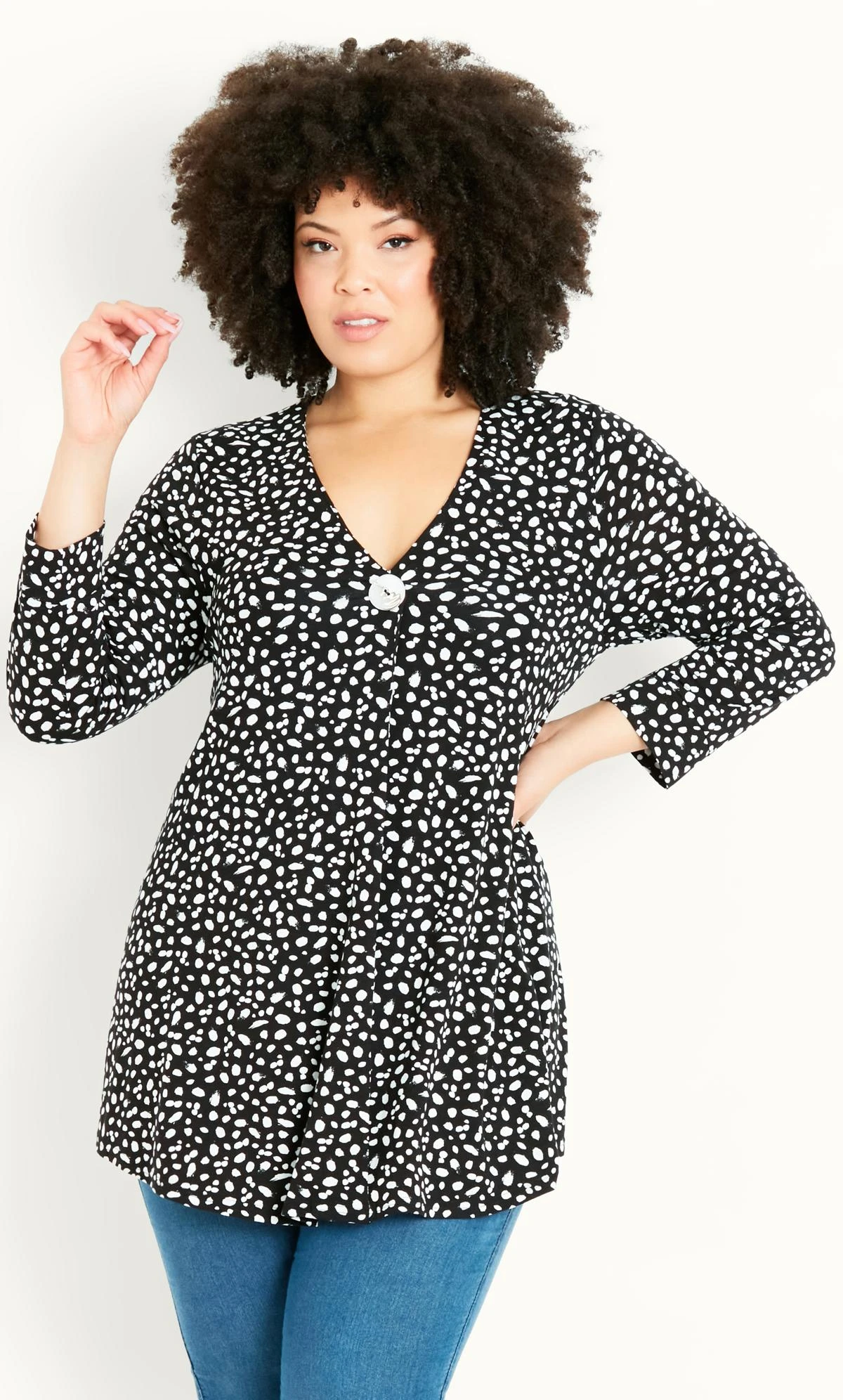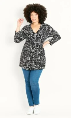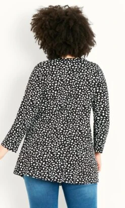 Unleash your fierce fashion sense with the Evans Black Animal Print Button Detail Top. This top features a captivating animal print with 3/4 length sleeves. The statement button adds a touch of flair, making this top a versatile choice for both casual outings and nights out.
