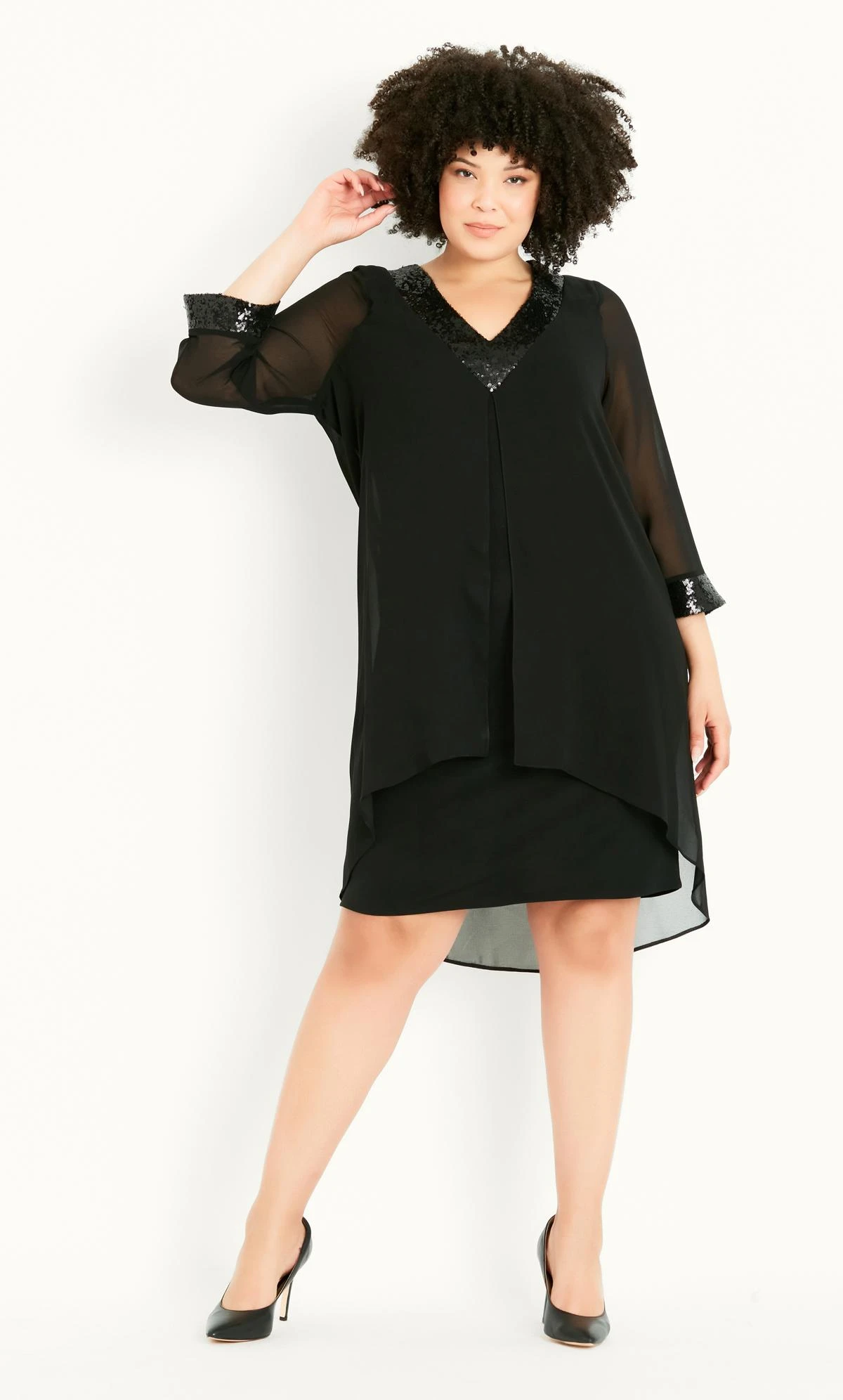 Get party ready in the Sequin Trim Dress. Comfort meets style with the sheer chiffon overlay and sequin trims, crafted in a soft stretch fabrication. You’ll love hitting the dance floor in this sparkling dress!