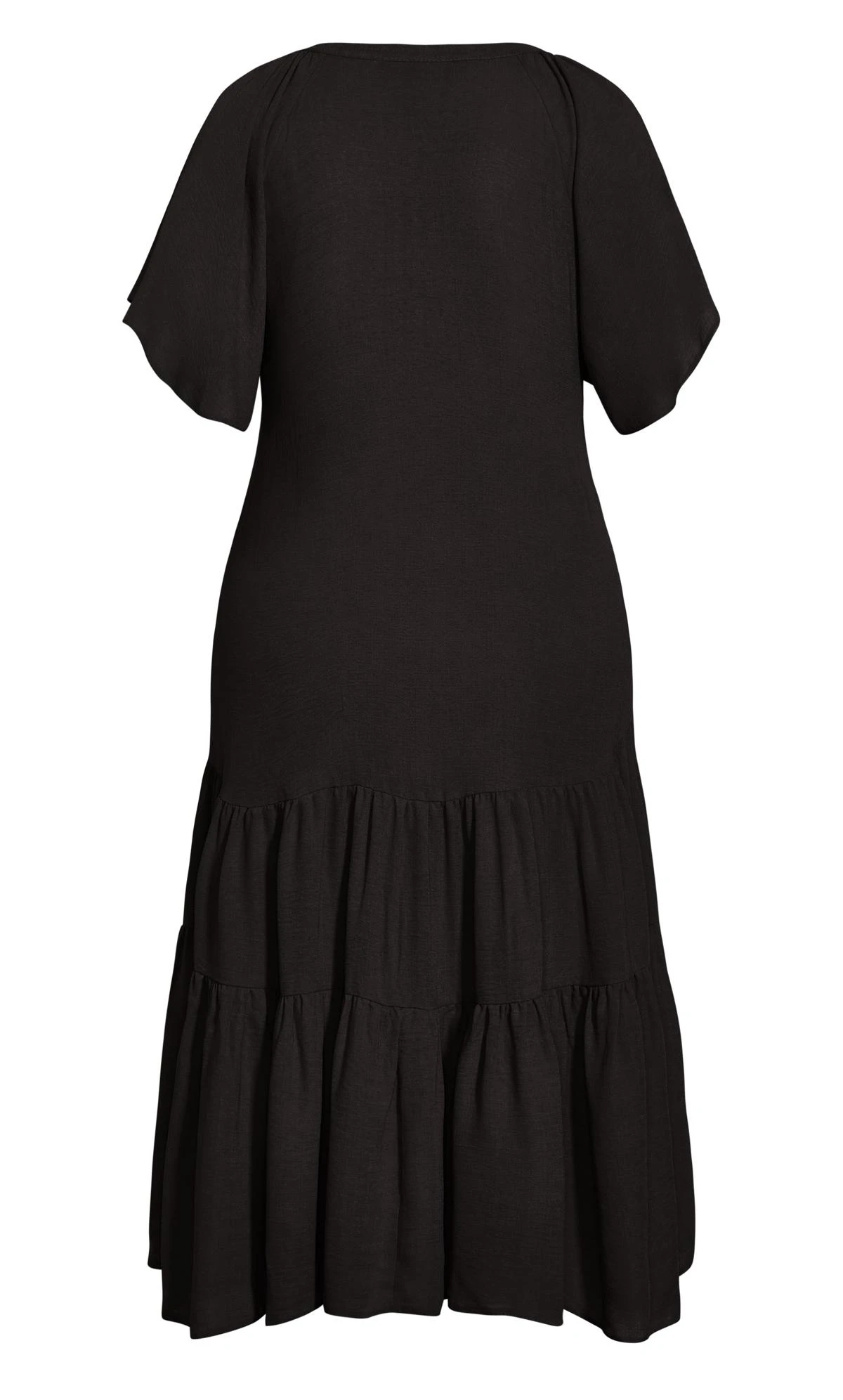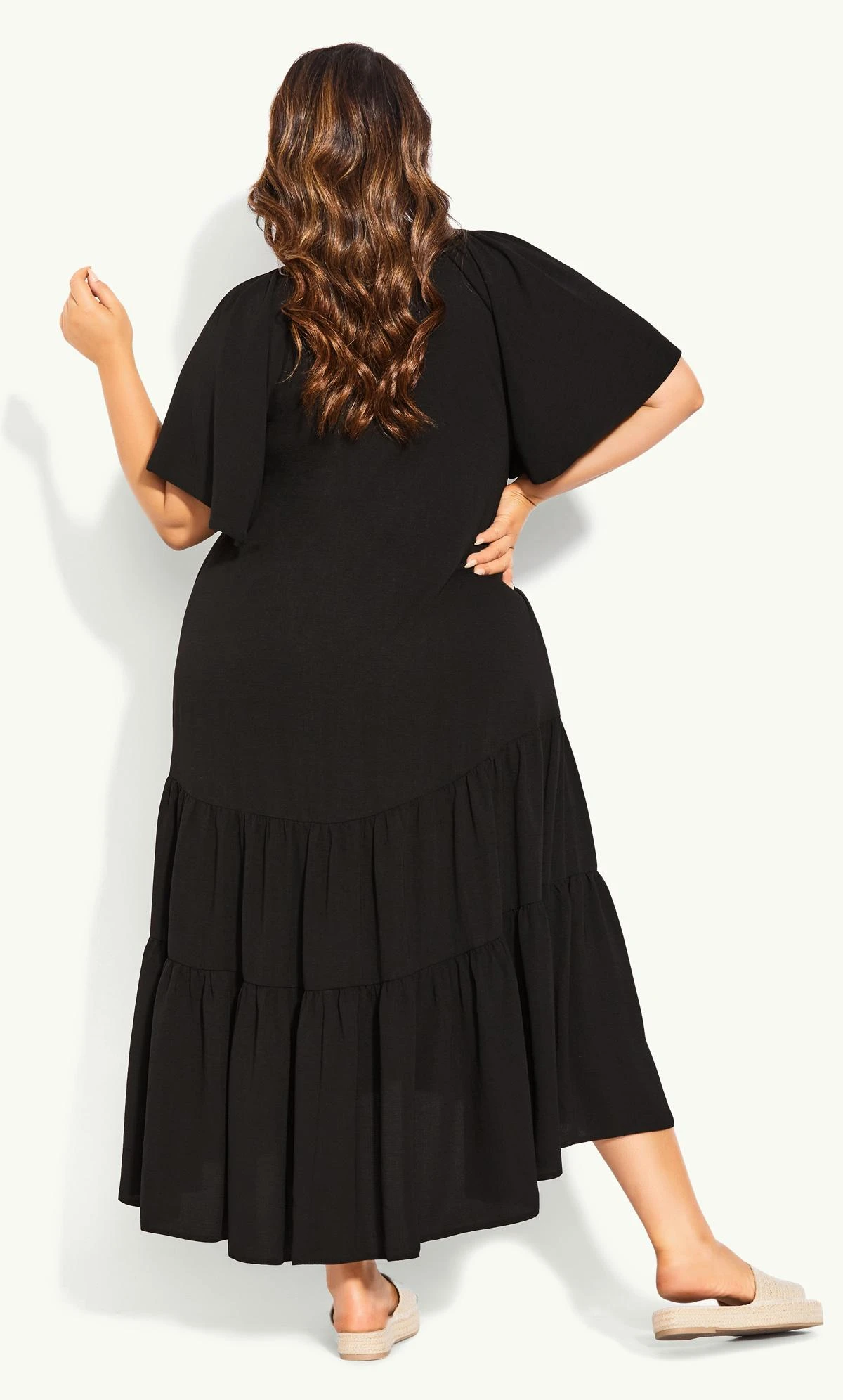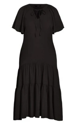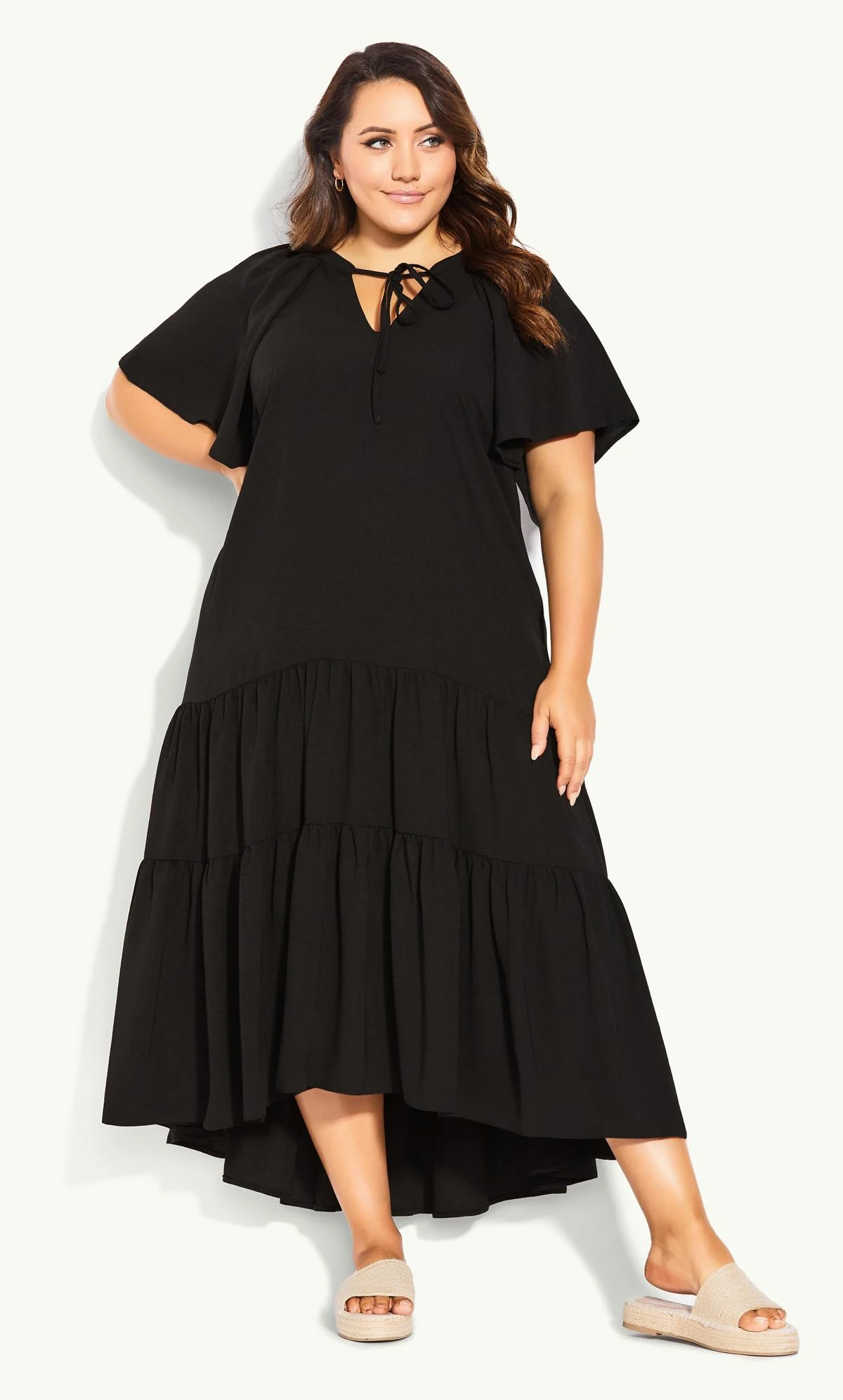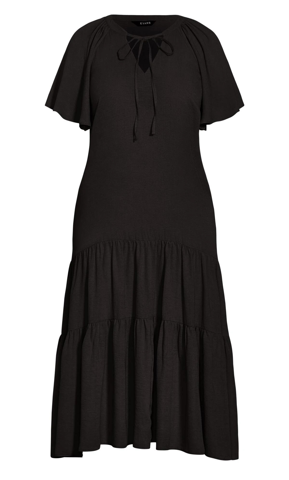 Make a stunning entrance with the Evans Black Tiered Tie Neck Maxi Dress. This captivating dress features a classic black hue and a tiered design with a tie neck detail, blending elegance with modern charm. Perfect for special occasions or stylish events, pair it with heels and minimal jewelry to create a chic and graceful ensemble that exudes confidence and style, ensuring you stand out in any crowd.