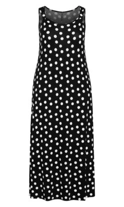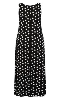 Discover the sophisticated Evans Black & White Polka Dot Maxi Dress, featuring a timeless polka dot pattern, adjustable waist, and flowing silhouette. Effortlessly stylish, pair with sandals and a hat for a versatile look.