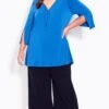 Style with a V-neck top, low-heeled sandals and bold lip for a stunning summer look.