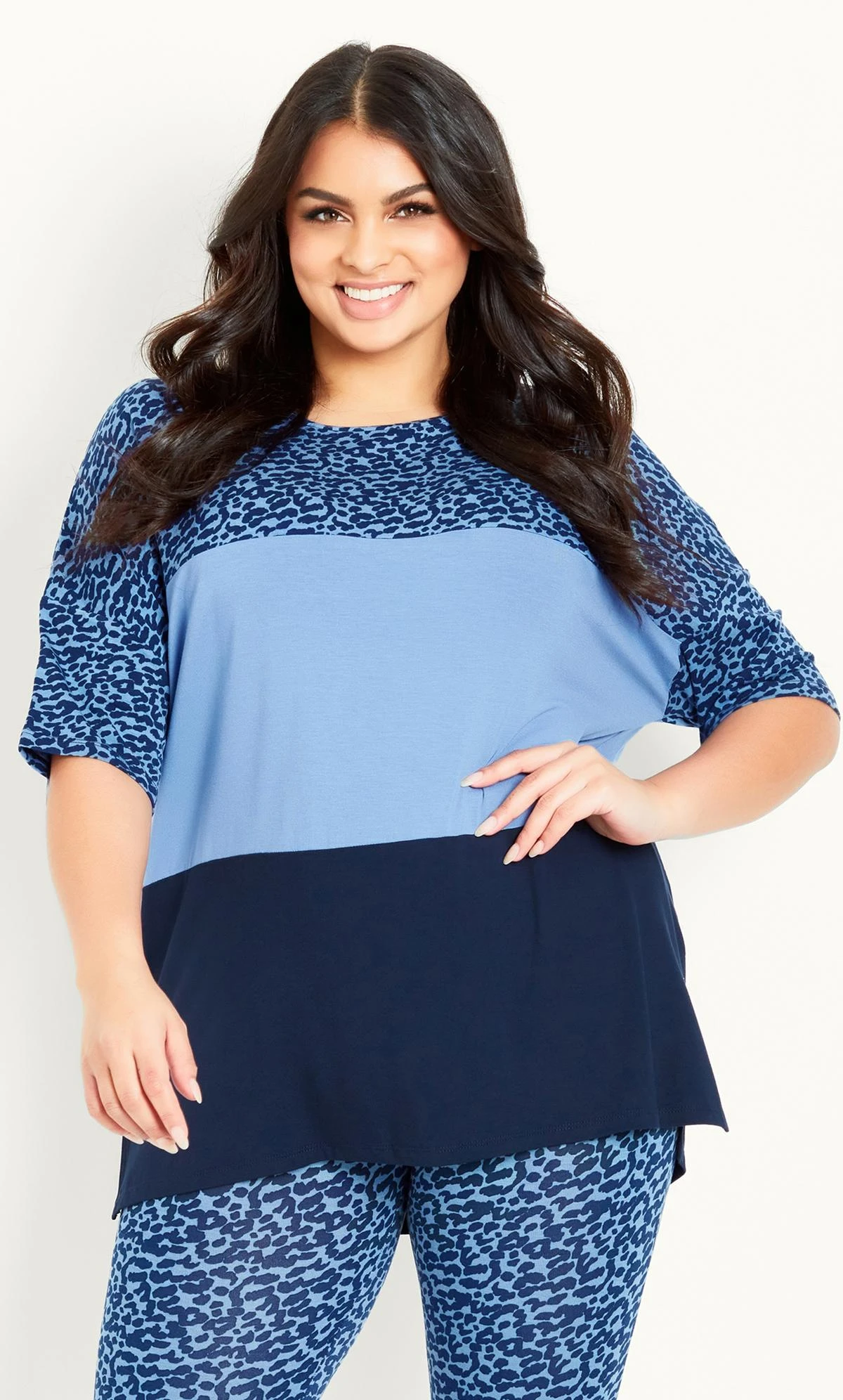For a fun pop of colour, style with our Animal Colour Block Top! Featuring a round neckline, relaxed fit and soft stretch fabrication, this top is easy for styling at home on a relaxing Sunday afternoon.