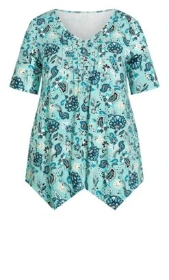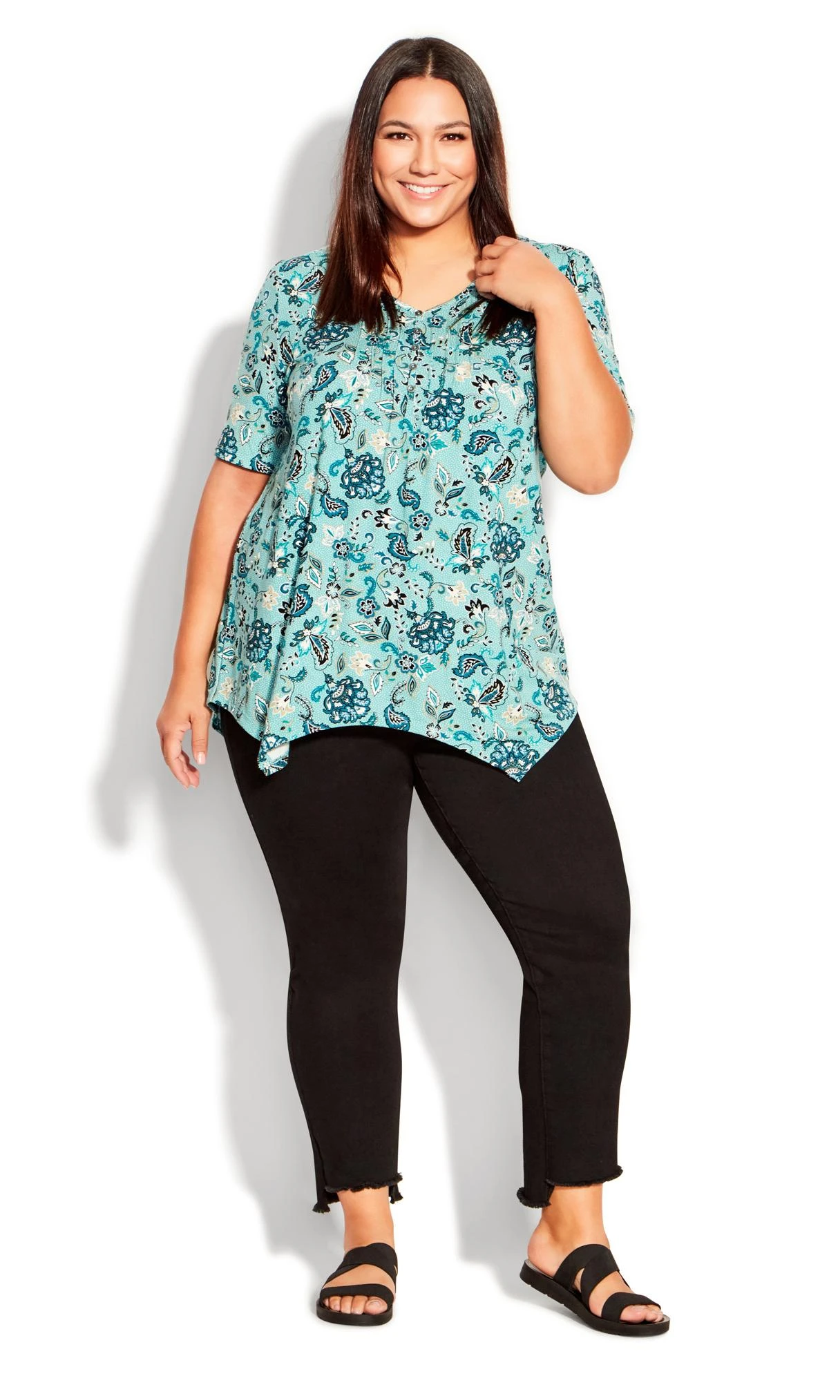 A perfect style for work or play, the Sharkbite Print Top is a playfully printed piece that you’re sure to love. Offering a chic pleated neckline detail and trendy shark bite hem, this relaxed belle has you covered for your next coffee date.