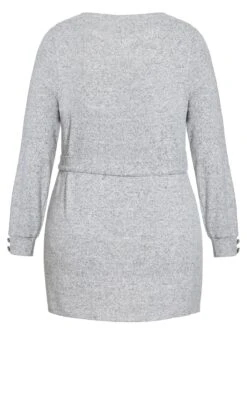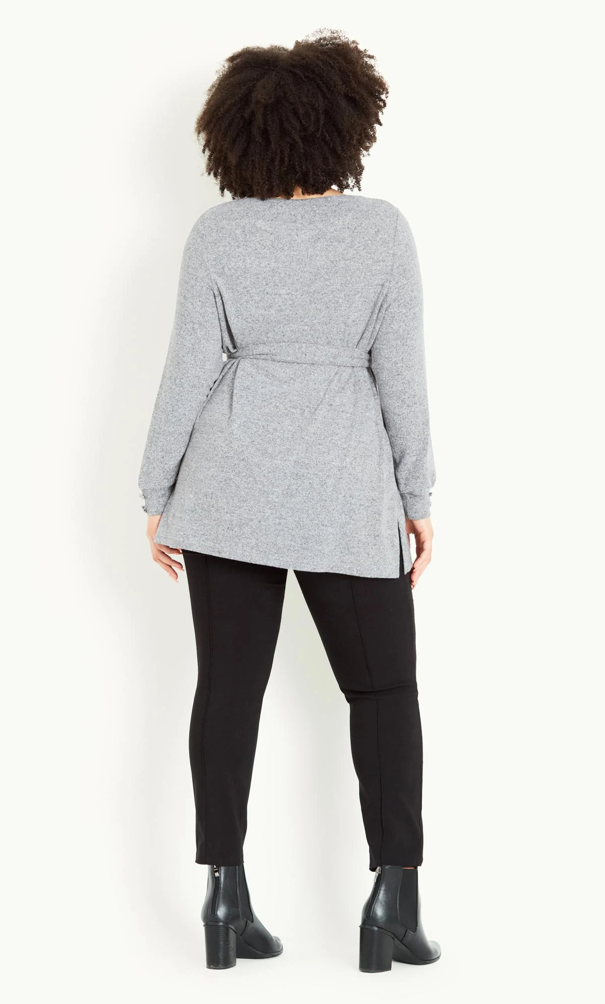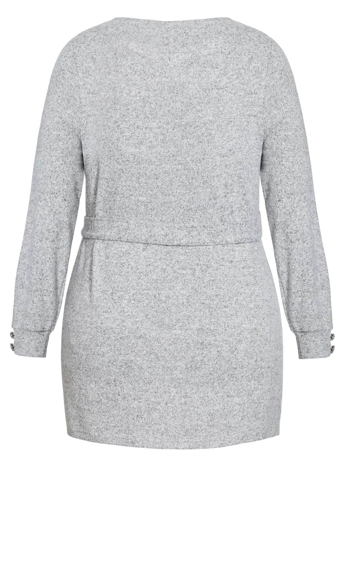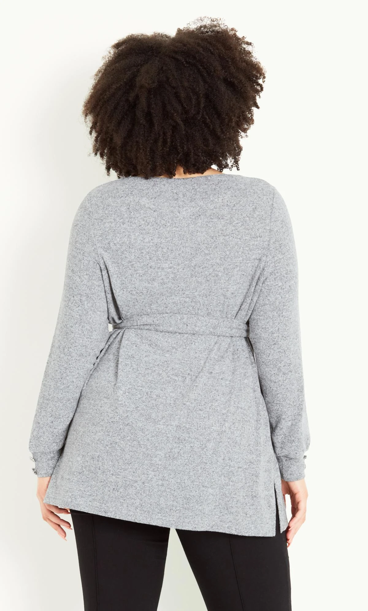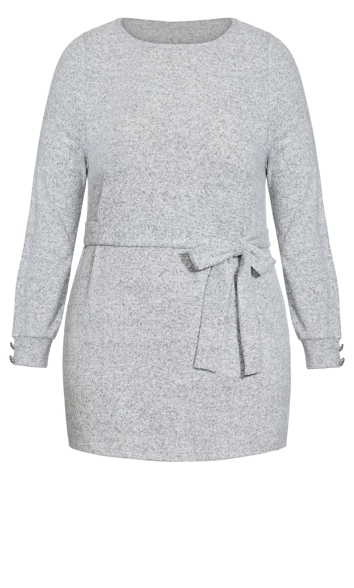 Step up your winter style with the Button Top! Boasting a round neckline, removable tie waist detail and bejewelled button cuffs, this grey top is a knit with a twist!